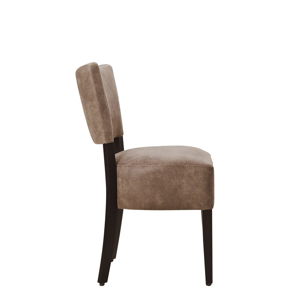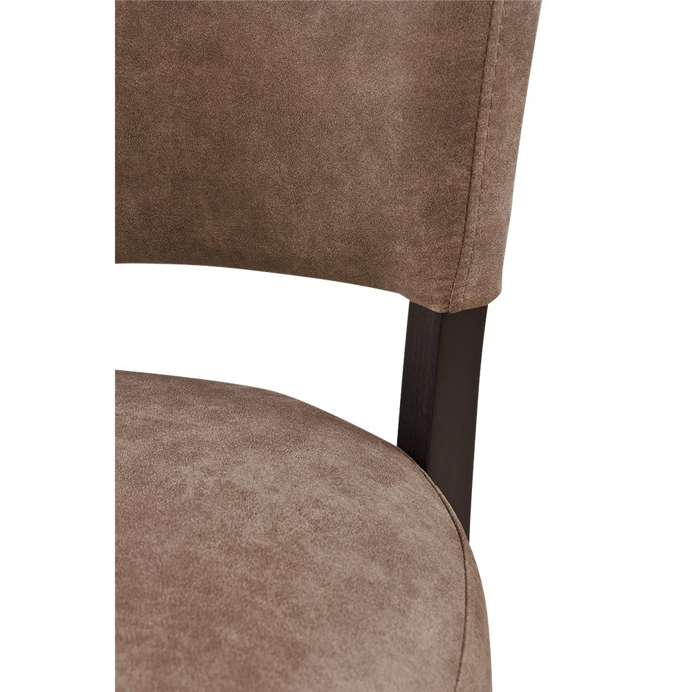 Der Bakino ist ein Vollpolsterstuhl mit einem dicken Polstersitz sowie einen gepolsterten Rücken. Die Füße sind in einem sehr dunklen Braun lackiert.