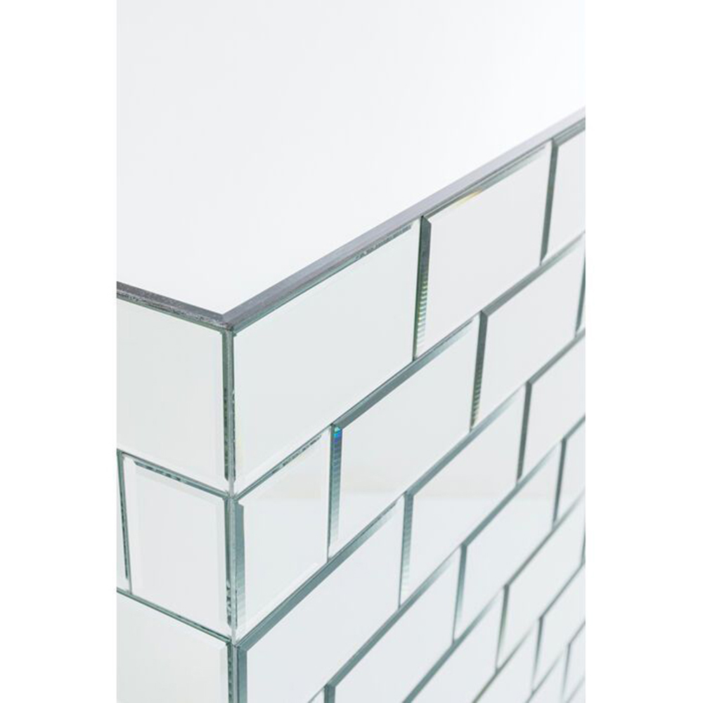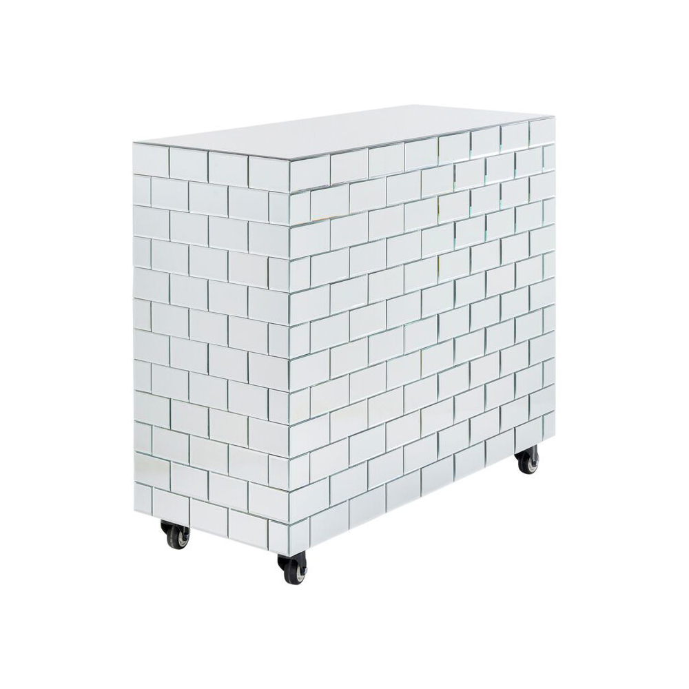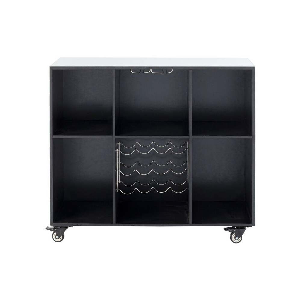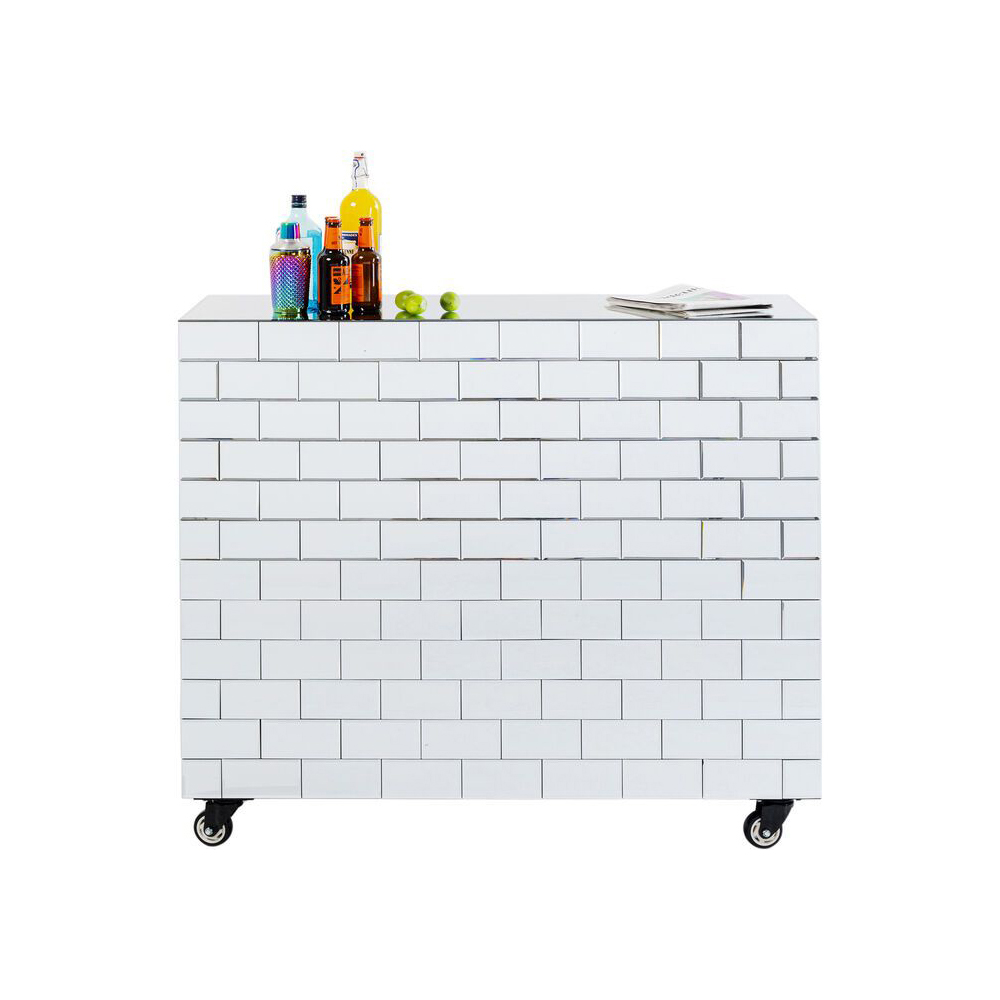 Die Bar verfügt über einen Korpus aus naturbelassener mitteldichter Faserplatte, während das Weinregal aus pulverbeschichtetem Stahl für den Rahmen und die Fußstütze besteht. Die Verkleidung ist aus verspiegeltem Glas gefertigt. Sie hat eine maximale Belastbarkeit von 30 kg und wird montiert geliefert. Zudem bietet sie eine Stauraumfunktion sowie Aufhänger für Weingläser.