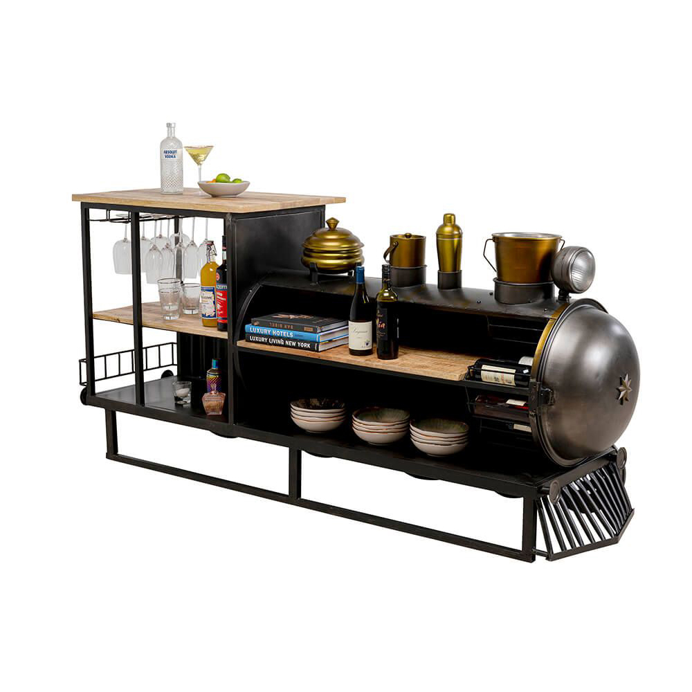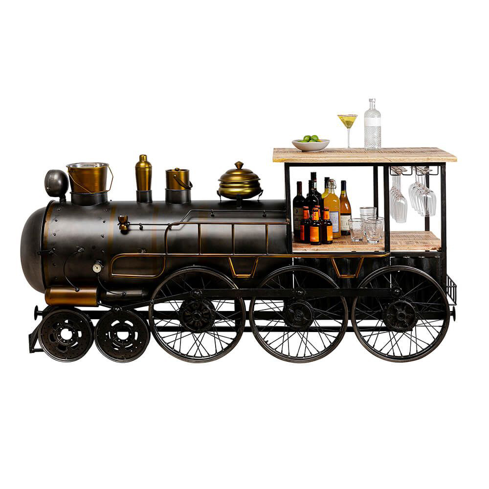 Eine einzigartige Hausbar in Form einer Lokomotive, gehalten in elegantem Schwarz. Sie wird von Hand aus robustem Mangoholz und Stahl gefertigt, was für Langlebigkeit und Stabilität sorgt. Goldene Verzierungen und Details verleihen ihr einen authentischen Look, der sofort ins Auge fällt. Der großzügige Stauraum bietet ausreichend Platz für Flaschen, diverse Ablageflächen und spezielle Halterungen für Flaschen. Zusätzlich ist sie mit einem funktionalen Cocktailshaker und Messbecher, einem Eisbehälter und einem Flaschenkühler ausgestattet, um alle Bedürfnisse bei der Zubereitung von Getränken zu erfüllen.