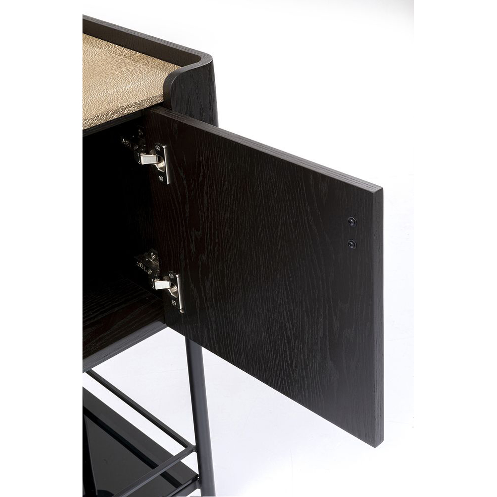 - Die Schönheit dieses Designerstücks zeigt sich auch im Inneren, wo großzügiger Stauraum und eine Aufhängung für Stielgläser hinter den Türen zu finden sind.
