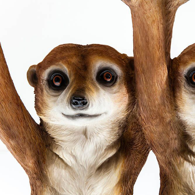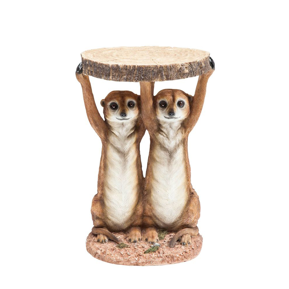 Erdmännchen-Duo Die charmanten Tiere sind für ihre lebhafte Natur und ihre unerschrockene Neugierde bekannt, die sie oft in ungewöhnliche Situationen führt. Eine davon ist die Verwendung als Beistelltisch. In diesem Doppelpack halten die beiden Erdmännchen die Tischplatte hoch und schauen dabei so verschmitzt, dass es eine wahre Freude ist, sie zu betrachten. Der Beistelltisch "Meerkat Sisters" fügt sich hervorragend in eine fantasievoll gestaltete Leseecke oder dient als dekoratives Element für Pflanzen.