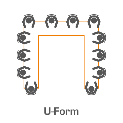 Bei der U-Form-Bestuhlung werden, wie aus dem Namen zu entnehmen, die Tische in Form eines „U“ angeordnet und daraufhin einseitig bestuhlt. Dadurch kann die Fläche innerhalb des „U“ zu einer Art ebenerdigen Bühne umfunktioniert werden. Dies bietet eine gute Möglichkeit für Präsentationen oder Reden.
