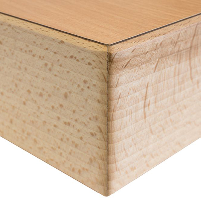 - Tischplatte: 20 mm Qualitätsspanplatte HPL-beschichtet mit einer 67mm Kante aus massiver Buche.