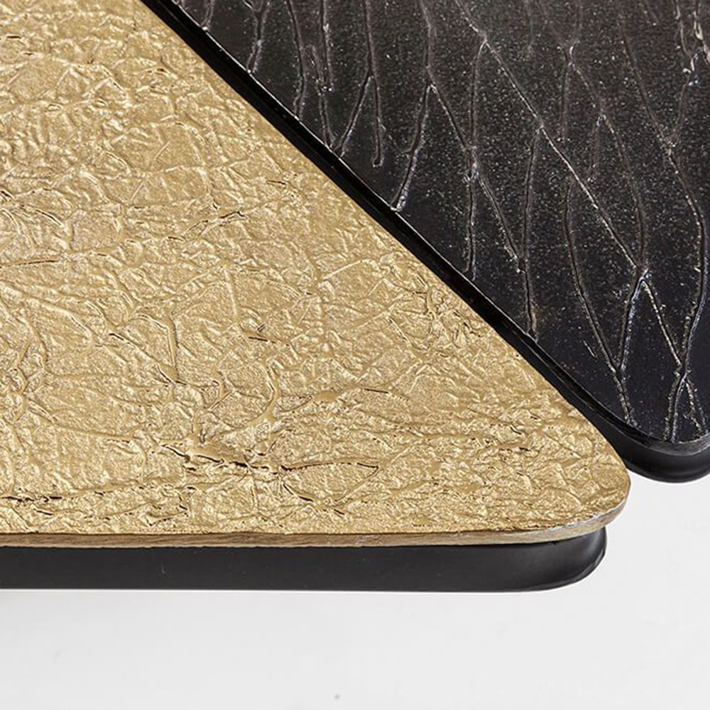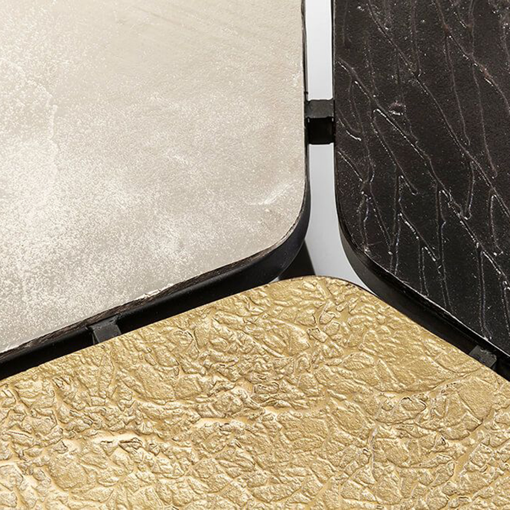 Ein großer, eckiger Couchtisch präsentiert sich mit drei farbigen Tischplatten, die von einem schwarzen Stahlgestell getragen werden. Die Tischplatte besteht aus drei asymmetrischen Elementen mit unterschiedlichen Oberflächenstrukturen, die in den Farben Bronze, Anthrazit und Grauweiß gehalten sind. Dieser Beistelltisch strahlt den Charakter eines künstlerischen Möbelobjekts aus. Er wurde massiv und solide aus Stahl und Aluminium gefertigt und wird bereits montiert geliefert. Seine natürlichen Farben und das von der Natur inspirierte Design harmonieren perfekt mit Holzmöbeln und Ledersofas.