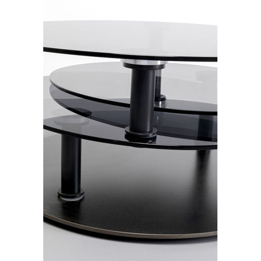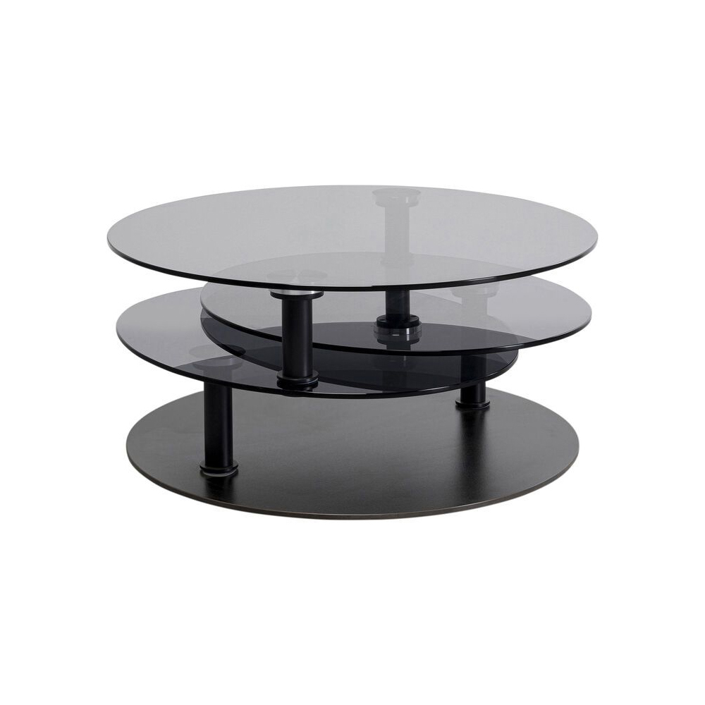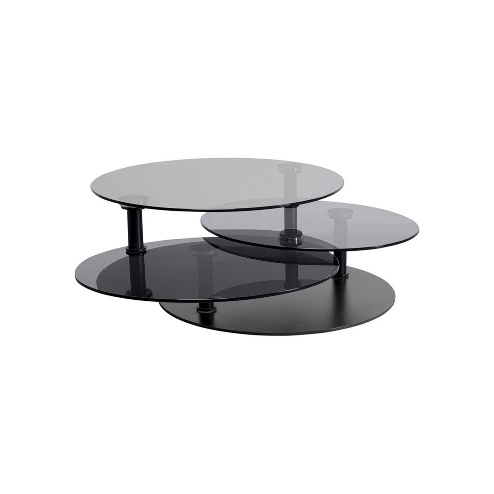 Der Couchtisch verfügt über eine Tischplatte aus gefärbtem Sicherheitsglas (ESG) mit einer Dicke von 10 mm. Die Beine sind aus lackiertem Stahl und verchromtem Aluminium gefertigt, während der Sockel aus lackiertem Steingut besteht. Mit einer maximalen Belastbarkeit von 15 kg kann der Tisch um 360 Grad gedreht werden.