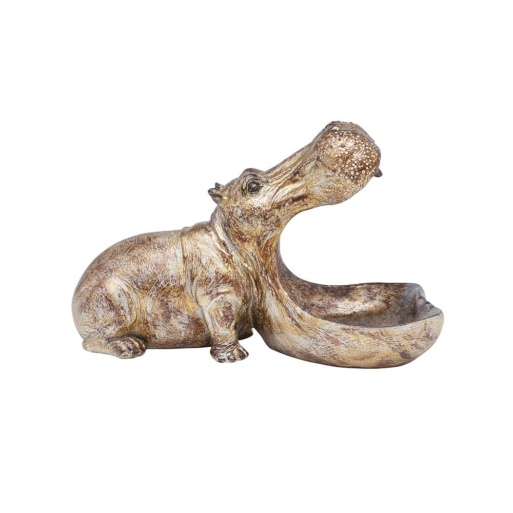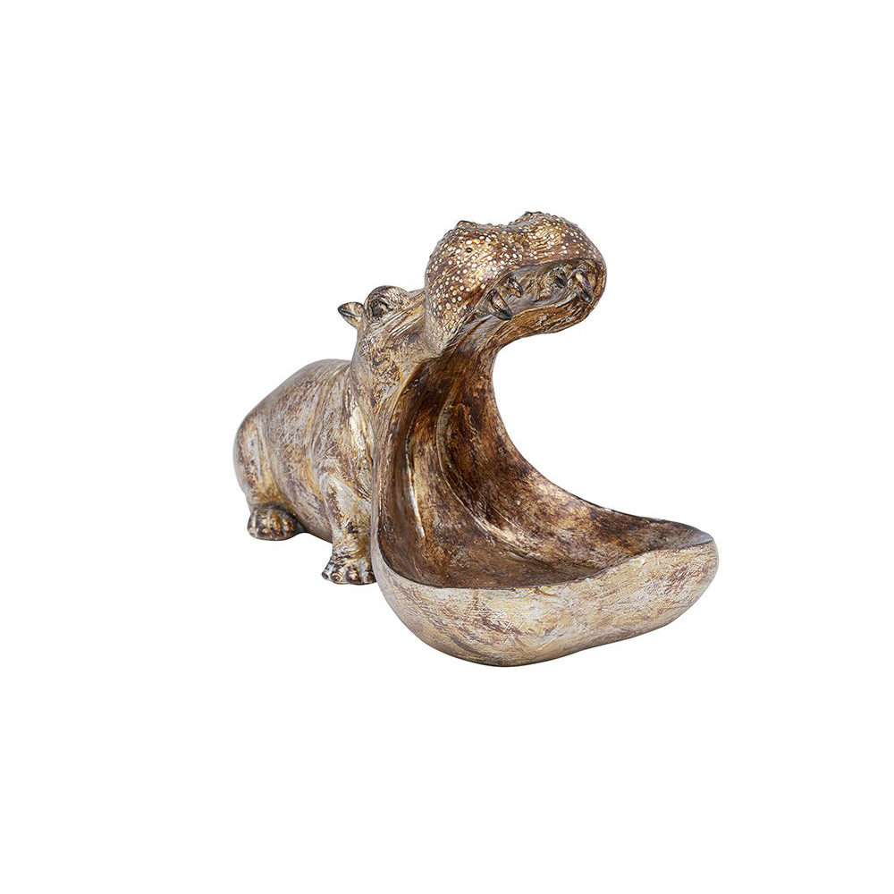 Inspiriert von Vintage-Ästhetik präsentiert sich dieses einzigartige Nilpferd-Dekor, dessen goldene Farbe und antikes Finish eine nostalgische Atmosphäre schaffen und jedem Raum eine besondere Note verleihen.