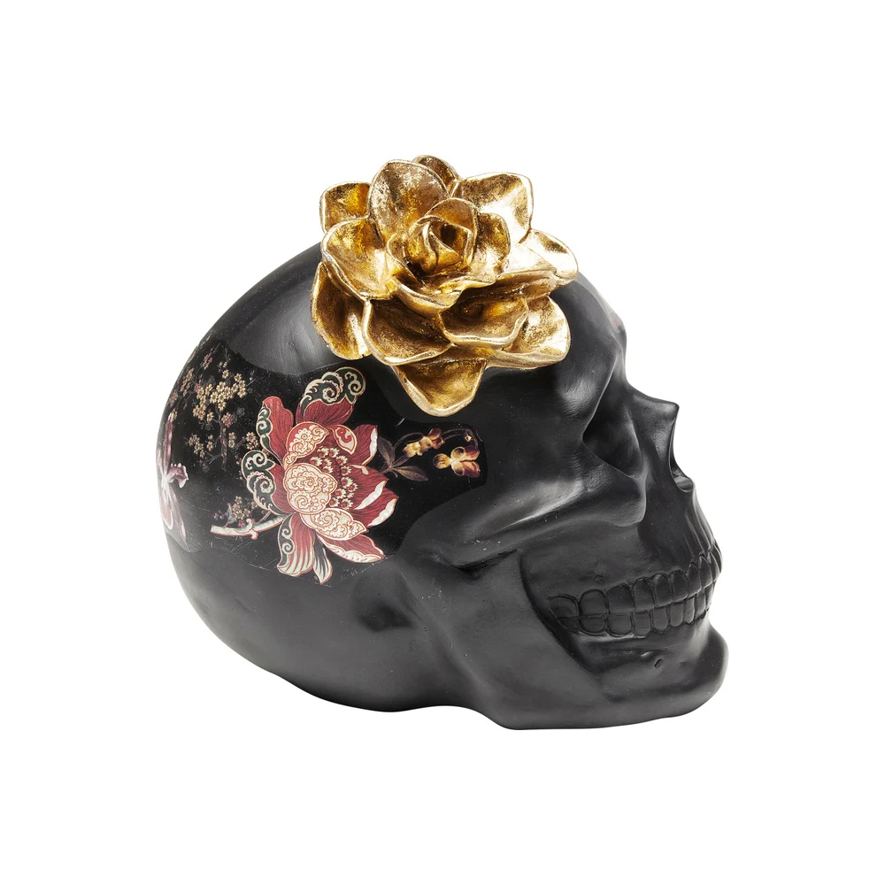- Origineller Eyecatcher: Der schwarze Totenkopf mit Blüte und Tattoo zieht alle Blicke auf sich