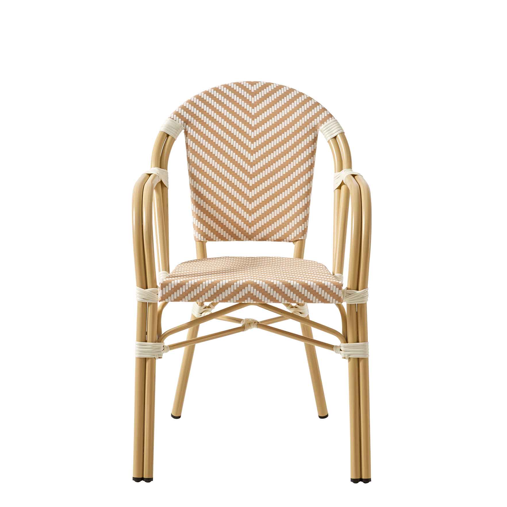 Der Outdoorstuhl Zypern-Arm Cream-White verbindet französischen Bistrostil mit hohem Sitzkomfort durch integrierte Armlehnen. Das rostfreie Aluminiumgestell, das UV-beständige Kunststoff-Geflecht und die stapelbare Konstruktion machen ihn zu einem langlebigen Terrassenstuhl für die Gastronomie, der sowohl gestalterische als auch wirtschaftliche Anforderungen erfüllt.