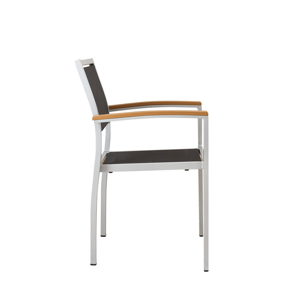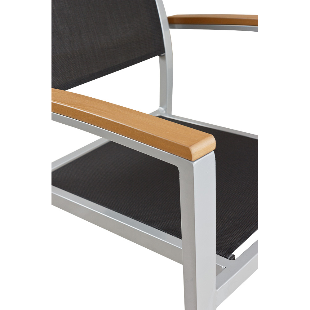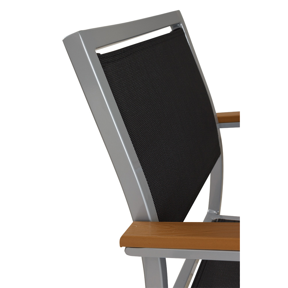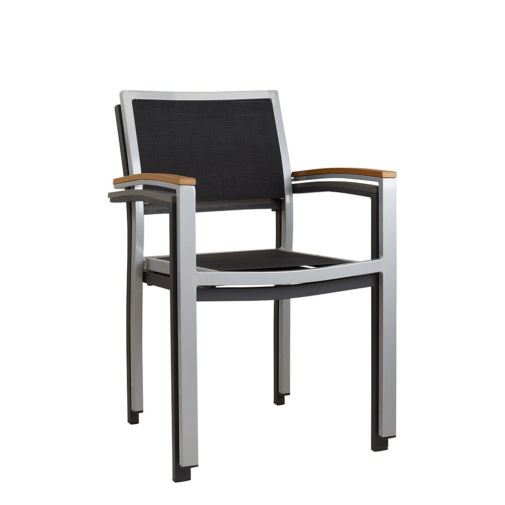 Der Georgia Silber-Schwarz ist eine gute Wahl für stilvolle und funktionale Außenbereiche in der Gastronomie, Hotelgewerbe und Veranstaltungsservice. Dank des stabilen Aluminiumgestells und der langlebigen Textilen-Bespannung bietet er nicht nur hohen Komfort, sondern ist auch pflegeleicht und witterungsbeständig – sinnvoll für den intensiven Einsatz im Freien. Die Polywood-Armlehnen verleihen dem Stuhl eine angenehme Haptik und fügen sich harmonisch in das zeitlose Design ein.