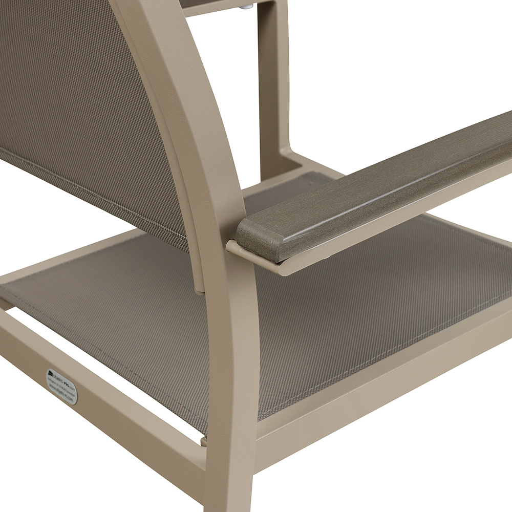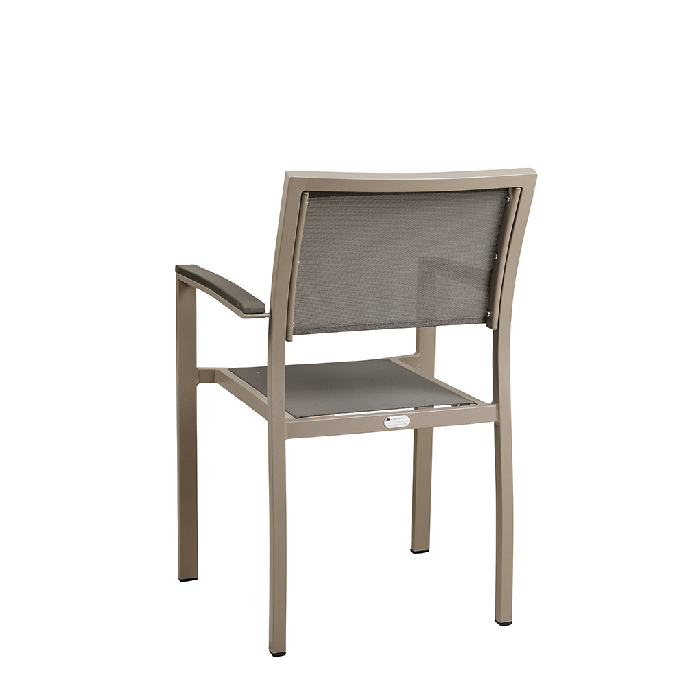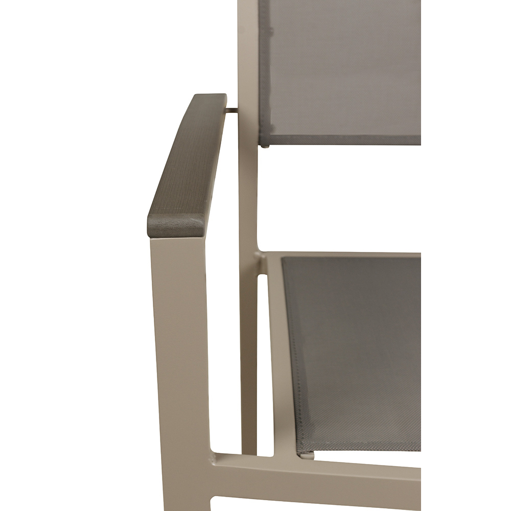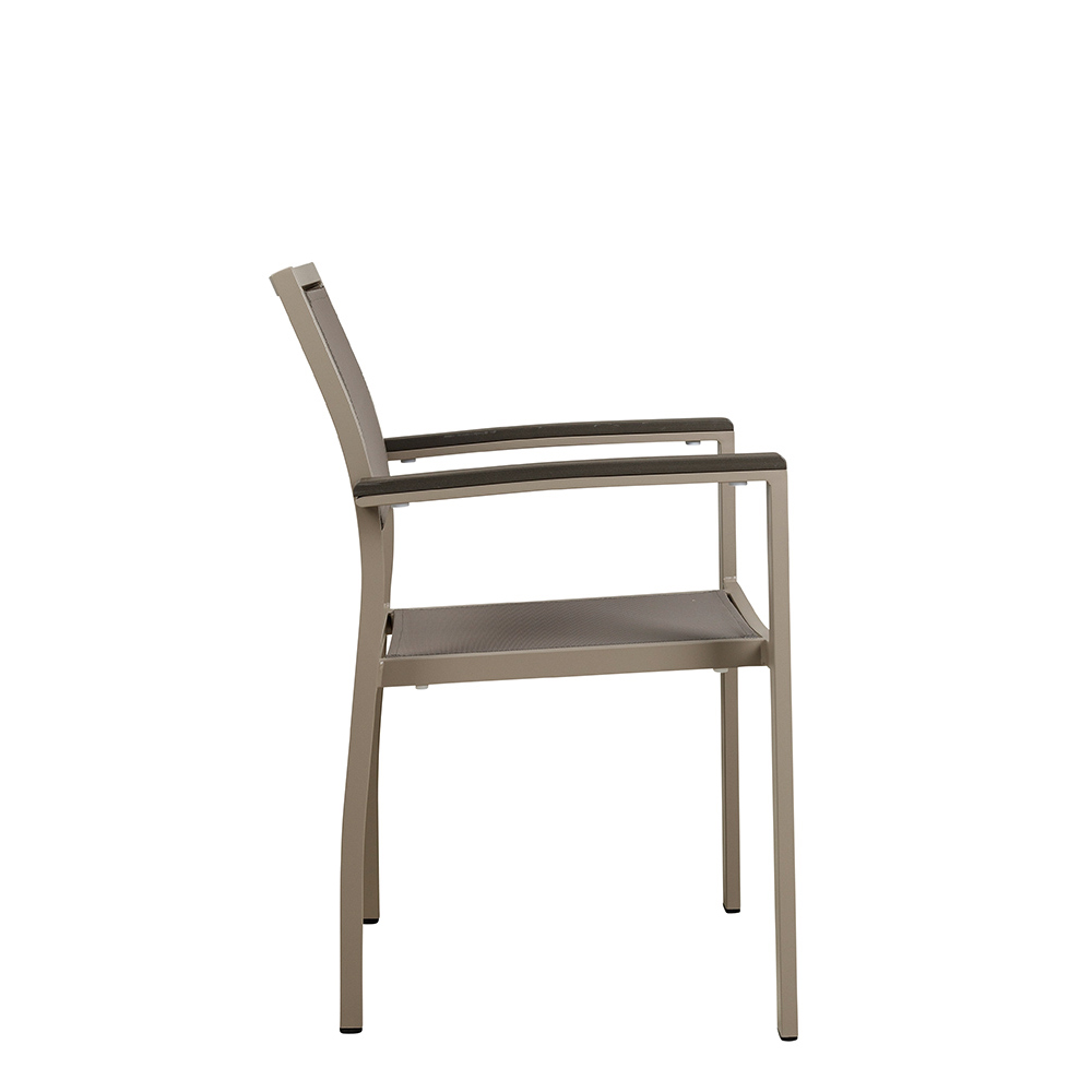 Der Georgia Taupe ist eine gute Wahl für stilvolle und funktionale Außenbereiche in der Gastronomie, Hotelgewerbe und Veranstaltungsservice. Dank des stabilen Aluminiumgestells und der langlebigen Textilen-Bespannung bietet er nicht nur hohen Komfort, sondern ist auch pflegeleicht und witterungsbeständig – sinnvoll für den intensiven Einsatz im Freien. Die Polywood-Armlehnen verleihen dem Stuhl eine angenehme Haptik und fügen sich harmonisch in das zeitlose Design ein.