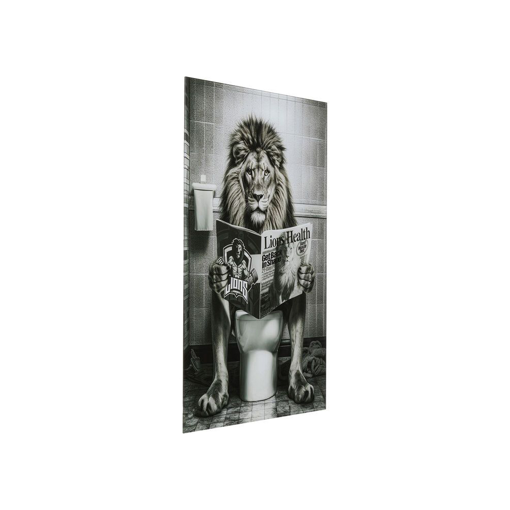 Das Glasbild präsentiert ein humorvolles Löwenmotiv. Hergestellt aus 4 mm dickem Sicherheitsglas (ESG), das foliert ist, eignet es sich für die vertikale Wandmontage.