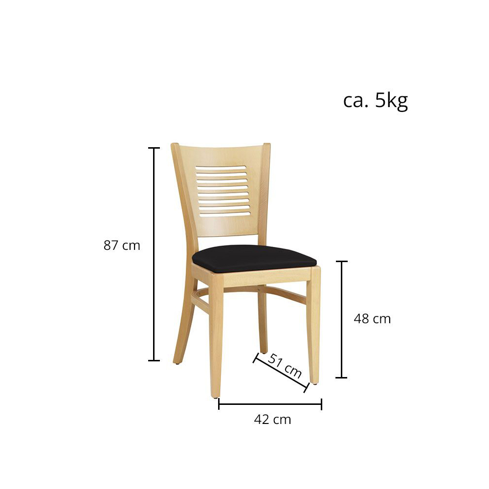 Der DARIO-200-P ist ein dezenter Restaurantstuhl mit Polstersitz. Die angeschrägte Rückenlehne mit Fräsung wirkt modern und dynamisch. Die Verstrebungen unter dem Sitz sorgen für zusätzliche Stabilität.