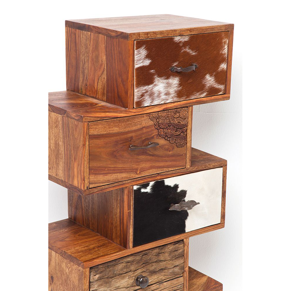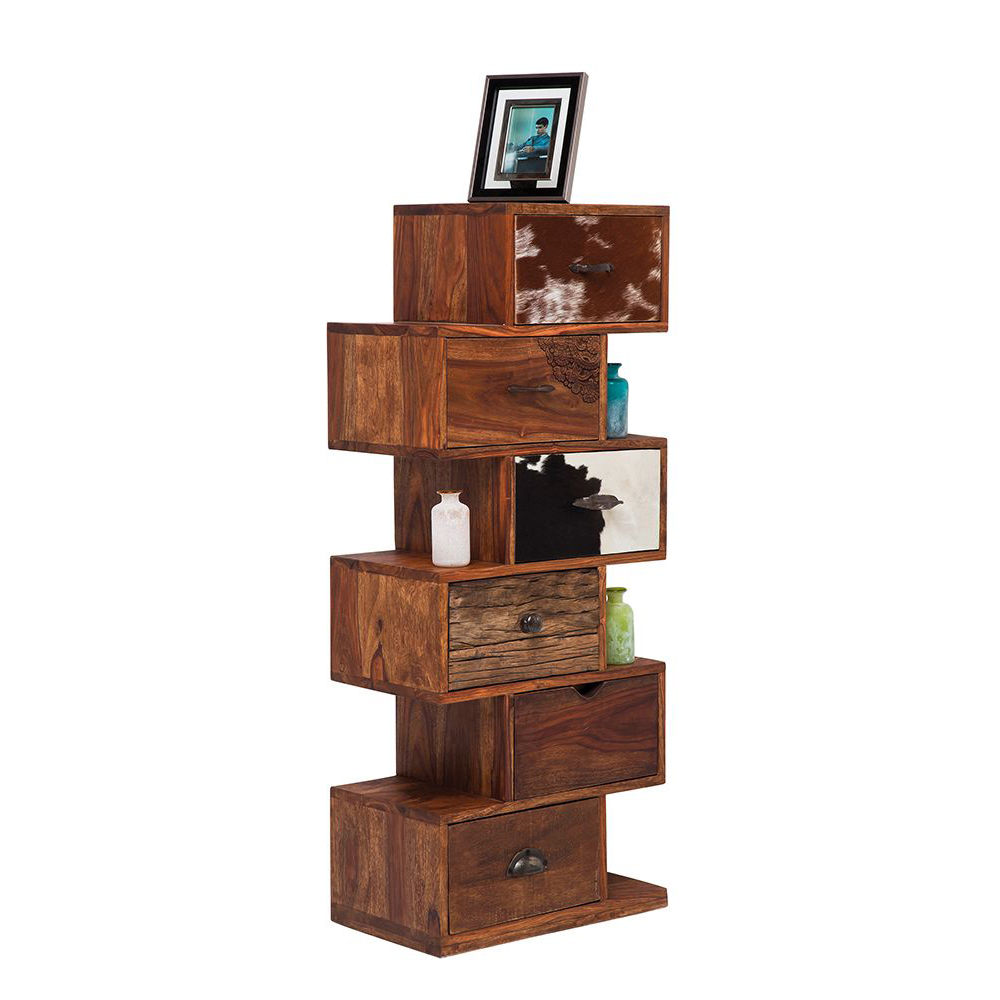 Die Kommode "Rodeo Zick Zack" mit 6 Schubladen ist ein einzigartiges Möbelstück aus lackiertem Sheesham-Holz. Die Griffe bestehen aus robustem Stahl und verleihen der Kommode einen modernen Look. Zwei der Schubladenfronten sind mit echtem Kuhfell verziert, was der Kommode einen rustikalen und zugleich eleganten Charme verleiht.