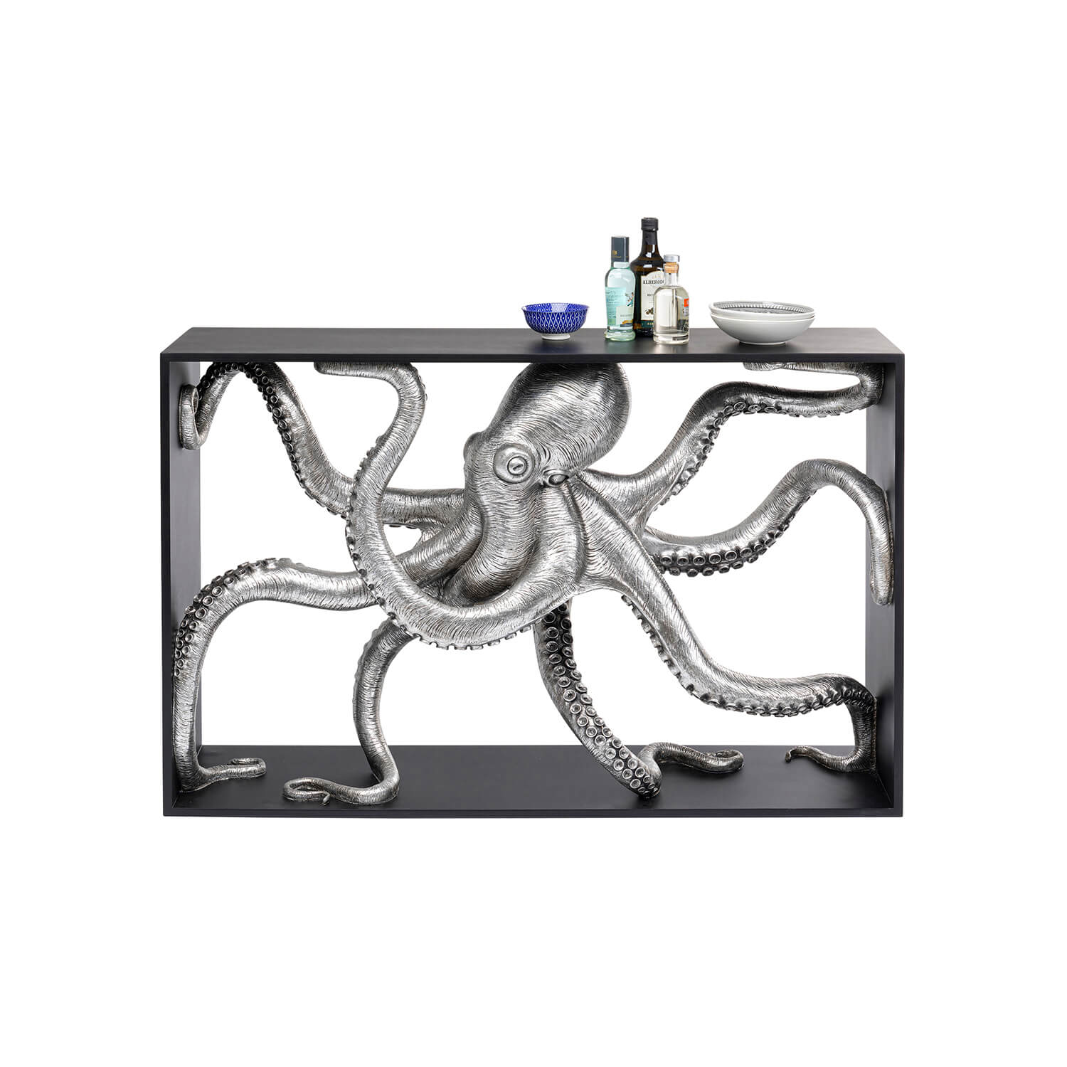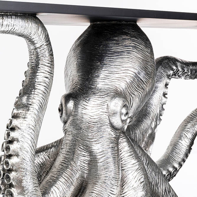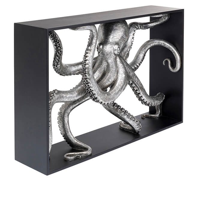 Der stabile Rahmen in Schwarz besteht aus Holz, während der Oktopus aus Kunststein in Silber gefertigt ist. Dieser Konsolentisch ist ein echter Eyecatcher im Wohnzimmer, Flur oder Schlafzimmer und zieht alle Blicke auf sich.