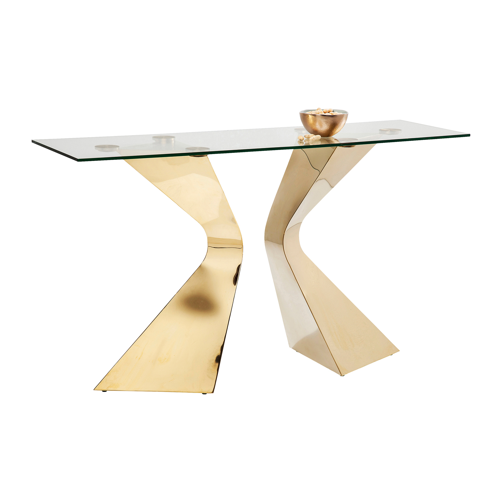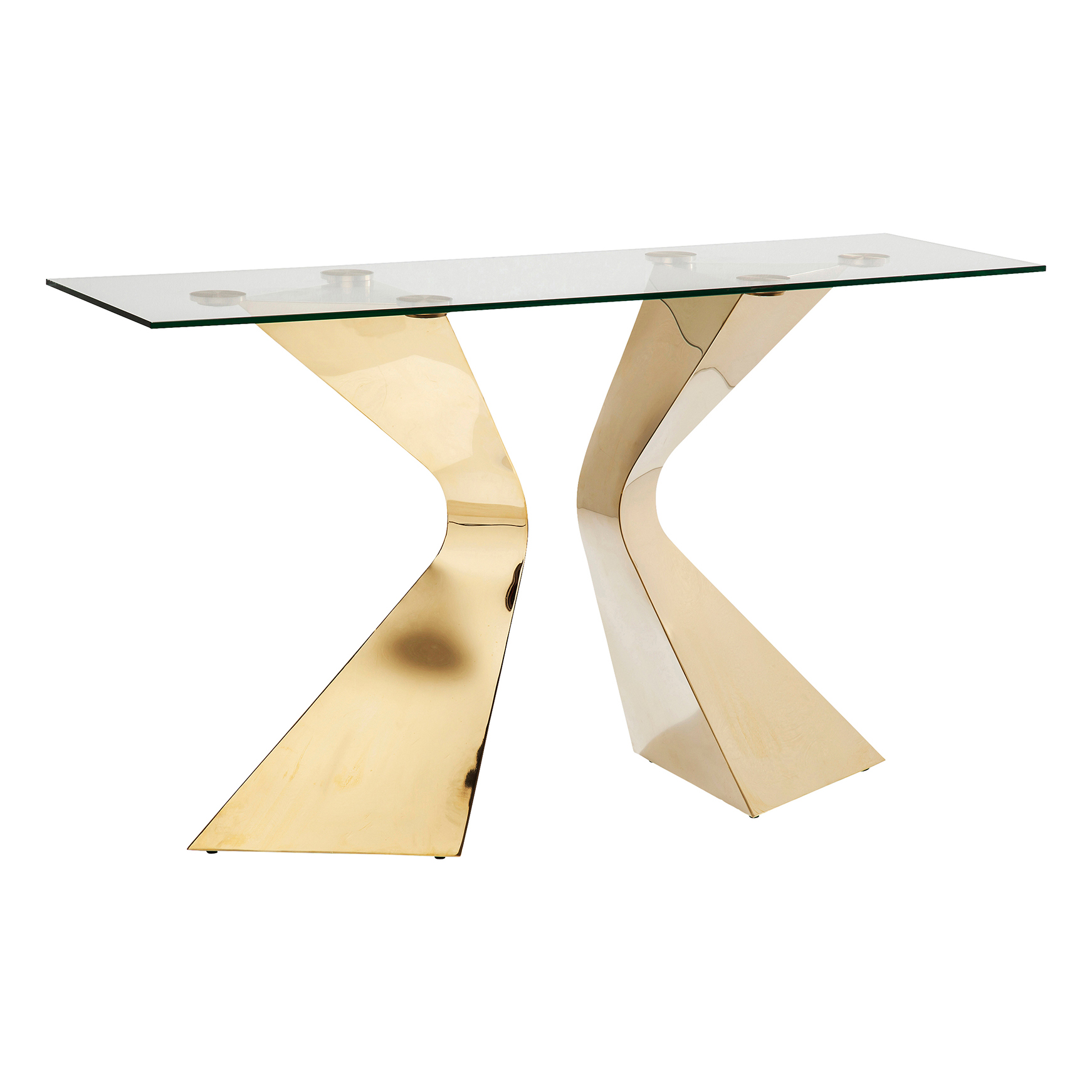 Die luxuriöse Konsole "Gloria Gold" besticht durch ihr goldenes Glanzfinish, die elegante Glasplatte und das skulpturale Edelstahl-Gestell. Als schicke Einrichtungslösung für jedes Entree ist dieser Flurtisch ein wahres Brillantstück und setzt glamouröse Akzente.