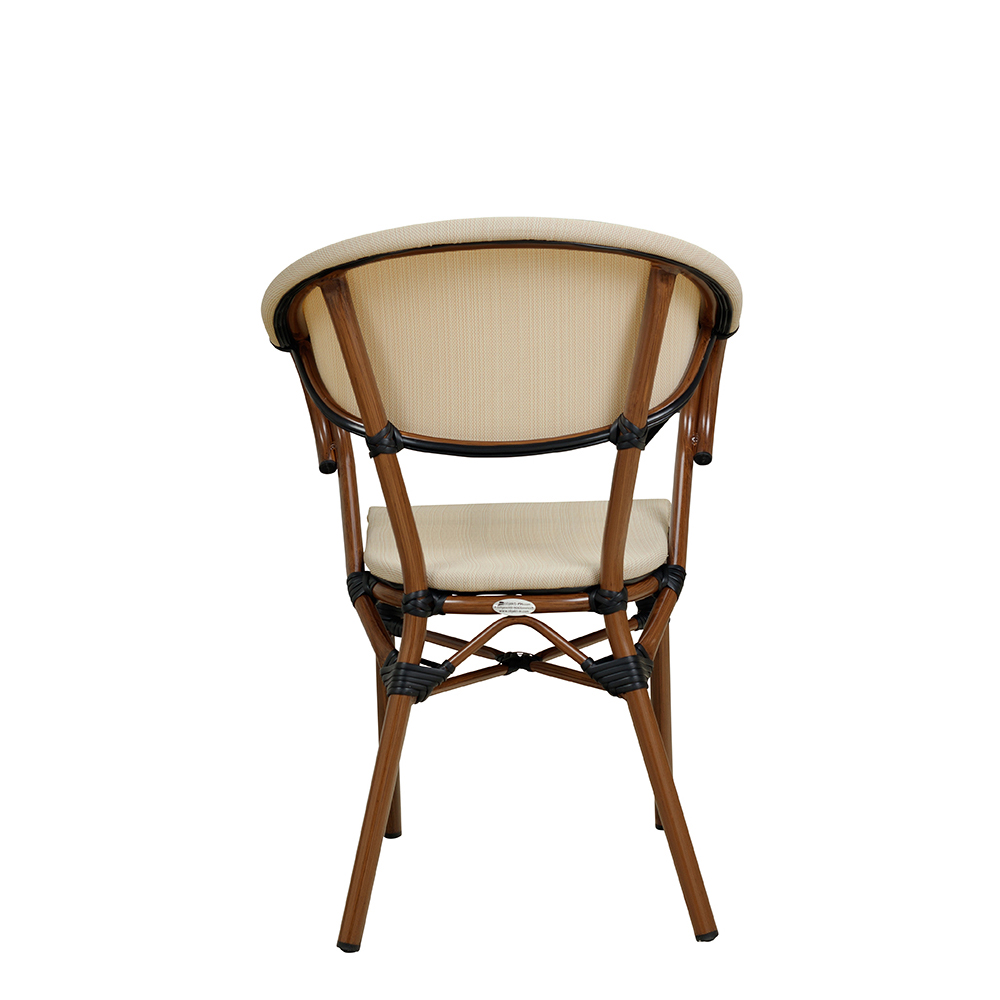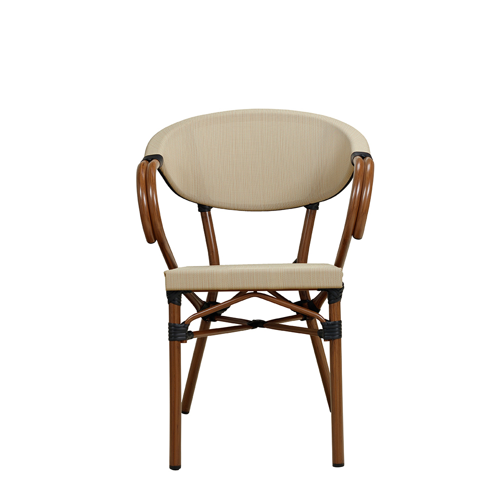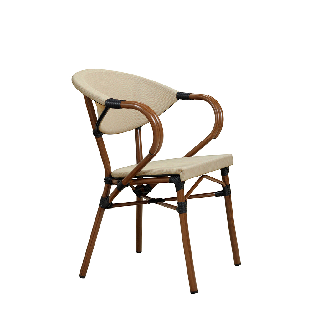 Der Ganua Cream vereint klassische Formen mit moderner Materialtechnologie – eine gute Wahl für den täglichen Einsatz in gastronomischen Außenbereichen. Mit seinem Aluminiumgestell in natürlicher Bambusoptik und UV-beständigem Textilen-Gewebe ist dieser Outdoor-Stuhl funktional, witterungsfest und optisch ansprechend zugleich.
