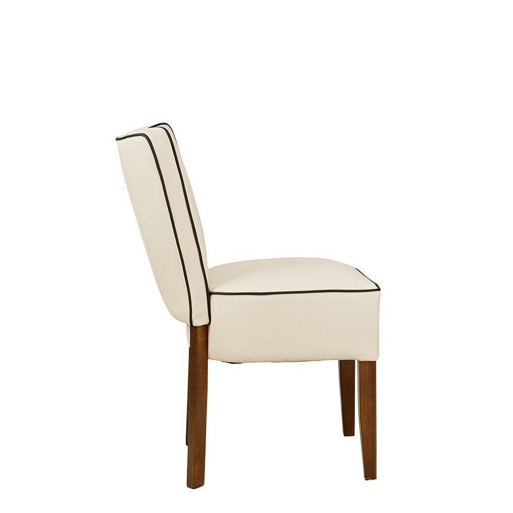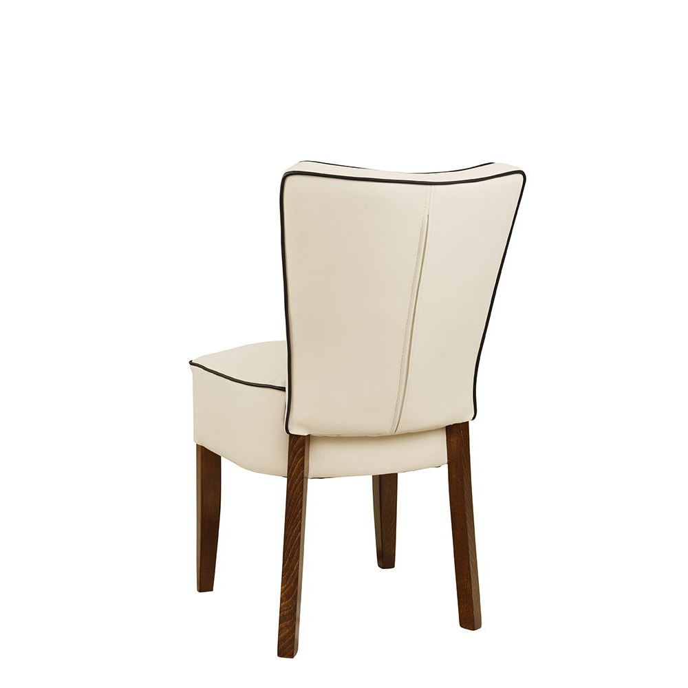Der Polsterstuhl Akina-200-Step ist für jeden Gastronomiebetrieb geeignet. Der gepolsterte Rücken ist mit einer Pfeifensteppung versehen. Kedernähte verzieren Sitz und Rücken.