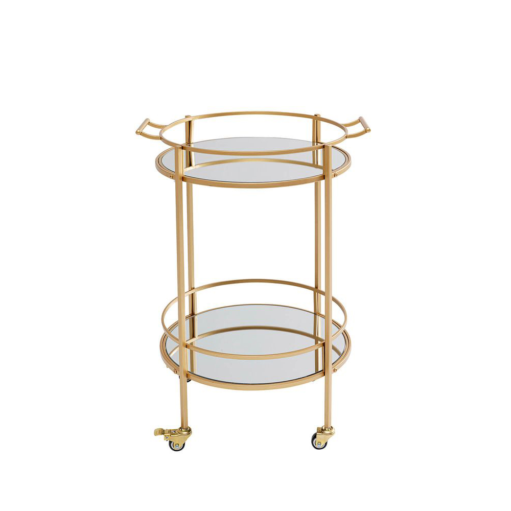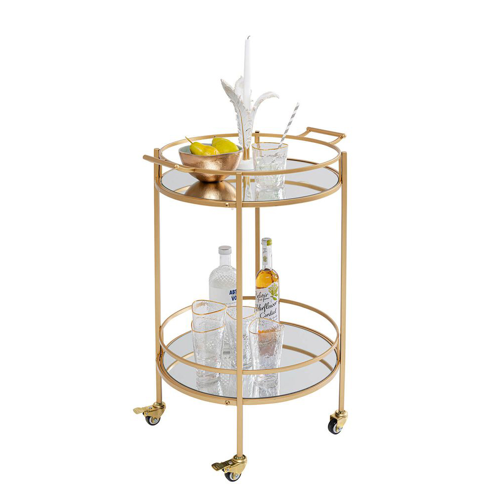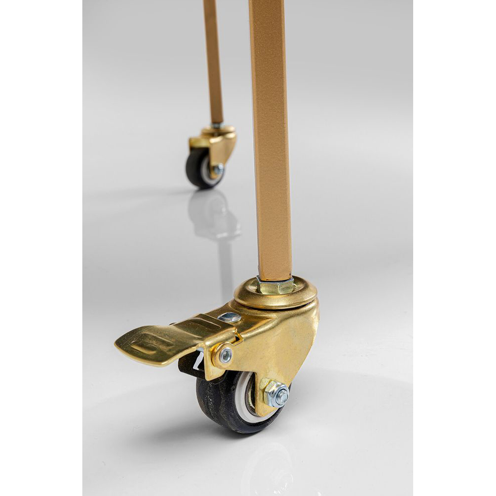 Mit bezaubernden Rundungen im eleganten Messing-Look und reflektierenden Ablagen strahlt dieser Servierwagen lässigen Hollywood-Glamour aus. Als rollbares Möbelstück ist er stets dort, wo Ihre Gäste sind, und vermittelt eine herzliche Gastfreundschaft. Vielseitig und flexibel einsetzbar, ob im Badezimmer für Parfumflakons, im Wohnzimmer als Hausbar oder in der Küche als stilvolle Ablage. Erlauben Sie sich kreativ zu sein: Dieses multifunktionale Möbelstück findet überall in Ihrer Wohnung Platz und sorgt für extravagante Abwechslung. Trotz seiner zarten und glamourösen Erscheinung ist dieser Servierwagen dank seines Stahlgestells und der Sicherheitsglasplatten äußerst robust und solide.