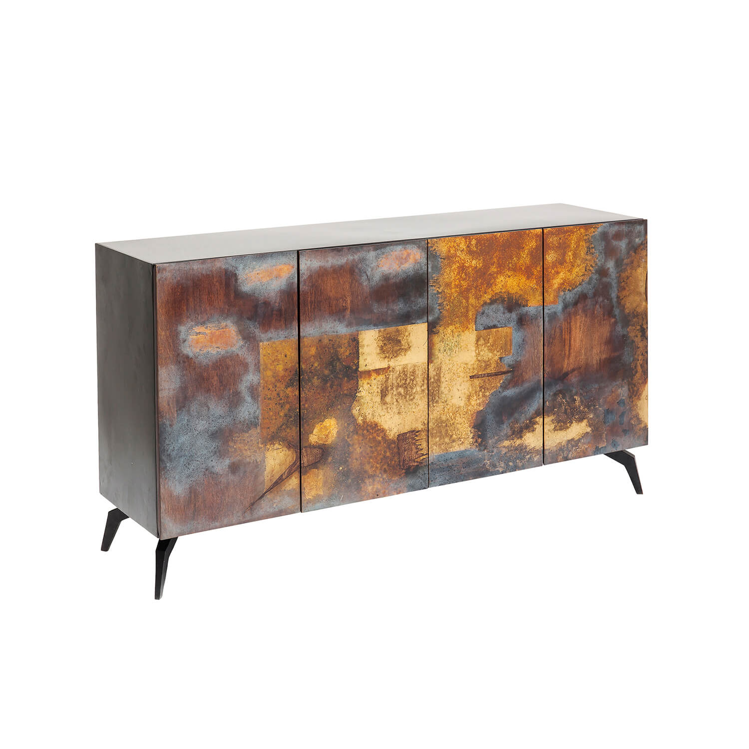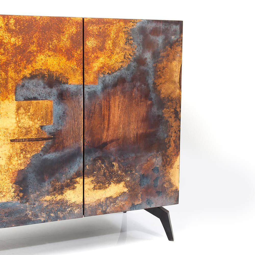 Das Sideboard Oxy ist ein einzigartiges Möbelstück im Industrial-Style, das durch kunstvoll gestaltete Türfronten von Hand gefertigt wurde und dadurch einen ganz eigenen Charakter erhält. Der Metall-Korpus des Sideboards ist mit Holztüren ausgestattet, die einen faszinierenden Farbverlauf im Oxy-Look zeigen. Die zeitlose Formsprache und die warmen Farben verleihen dem Sideboard eine gemütliche Atmosphäre und machen es zu einem Freund fürs Leben.