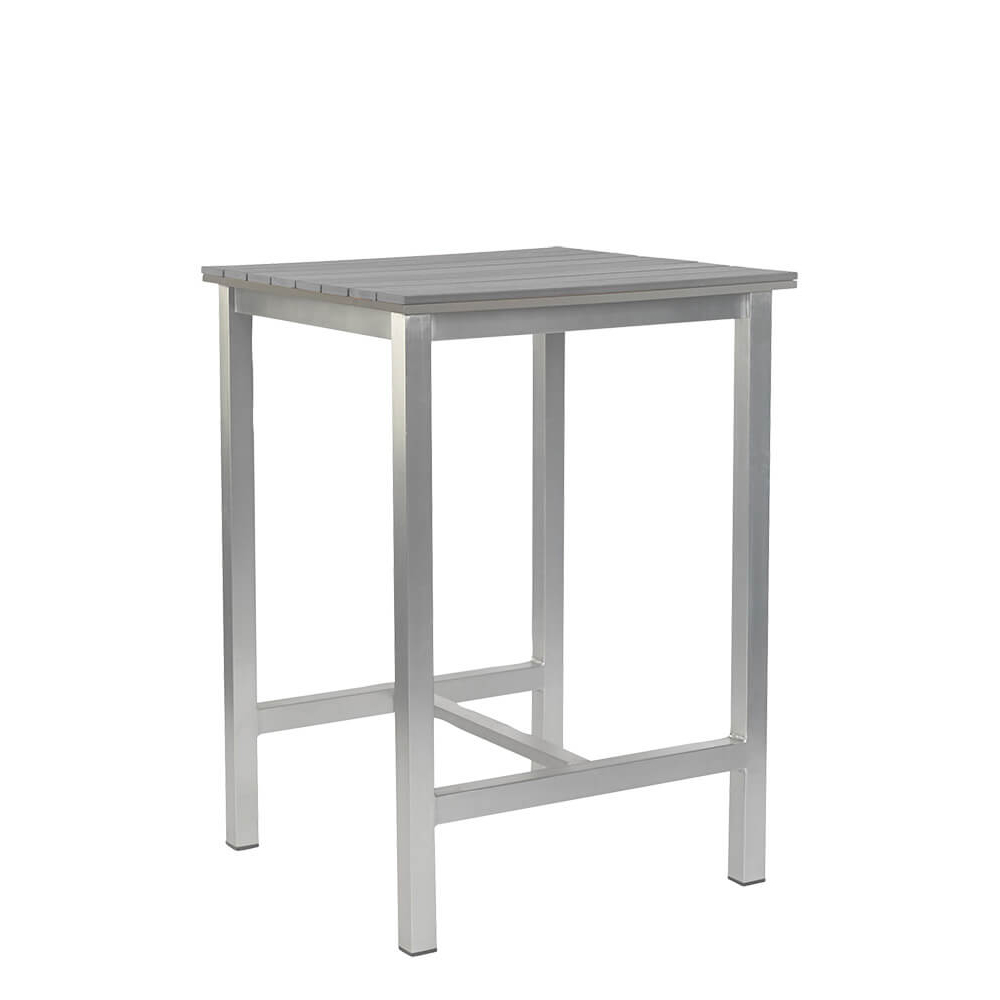 Das Simeo-High-Tischgestell mit Polywood-Lattung eignet sich hervorragend für den Außenbereich, insbesondere für Bars.