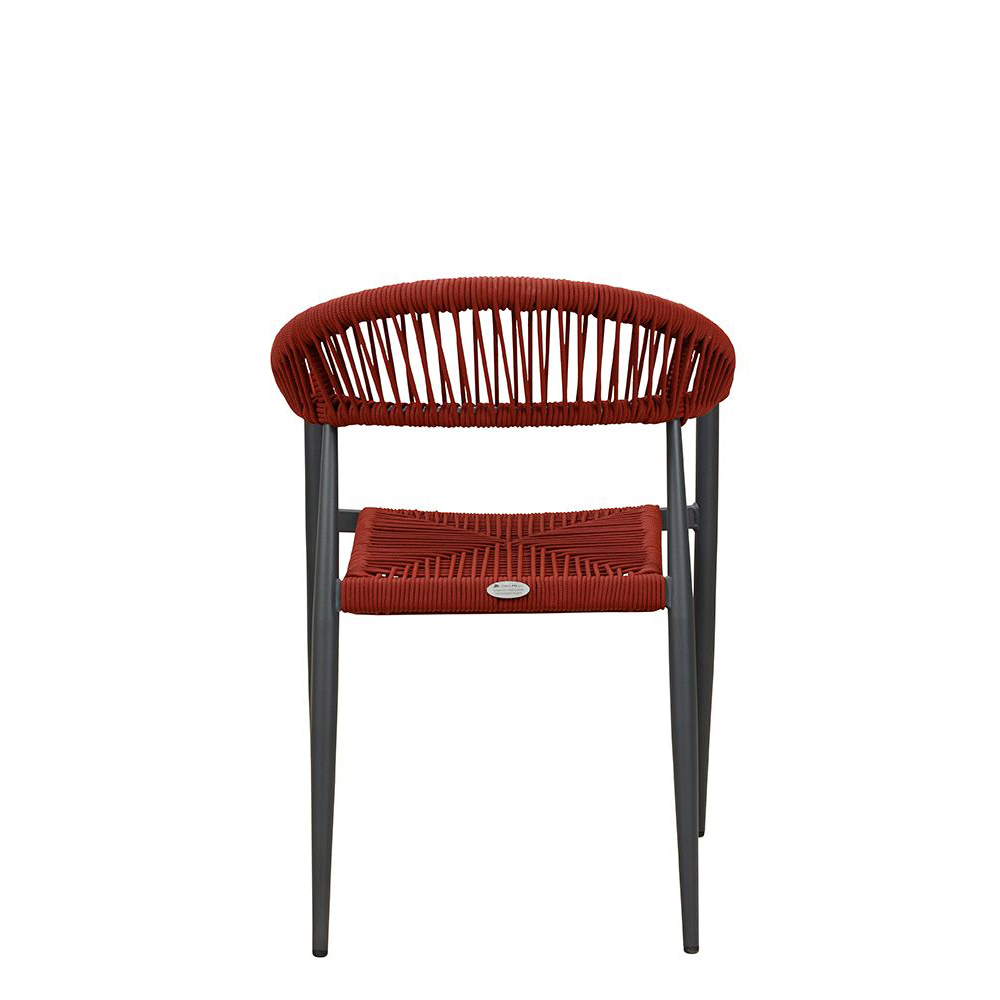 Ein Terrassenstuhl mit Armlehnen für höheren Sitzkomfort. Sitz und Rücken sind mit strapazierfähigen, witterungsbeständigem und pflegeleichtem Outdoorseil bespannt. Das Seil ist schnell trocknend. Der Stuhl ist stapelbar.