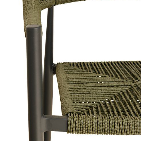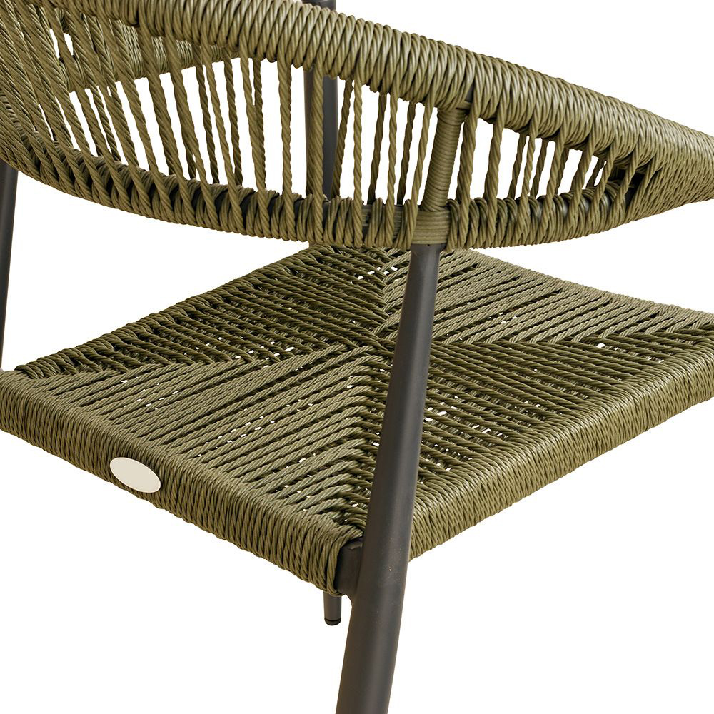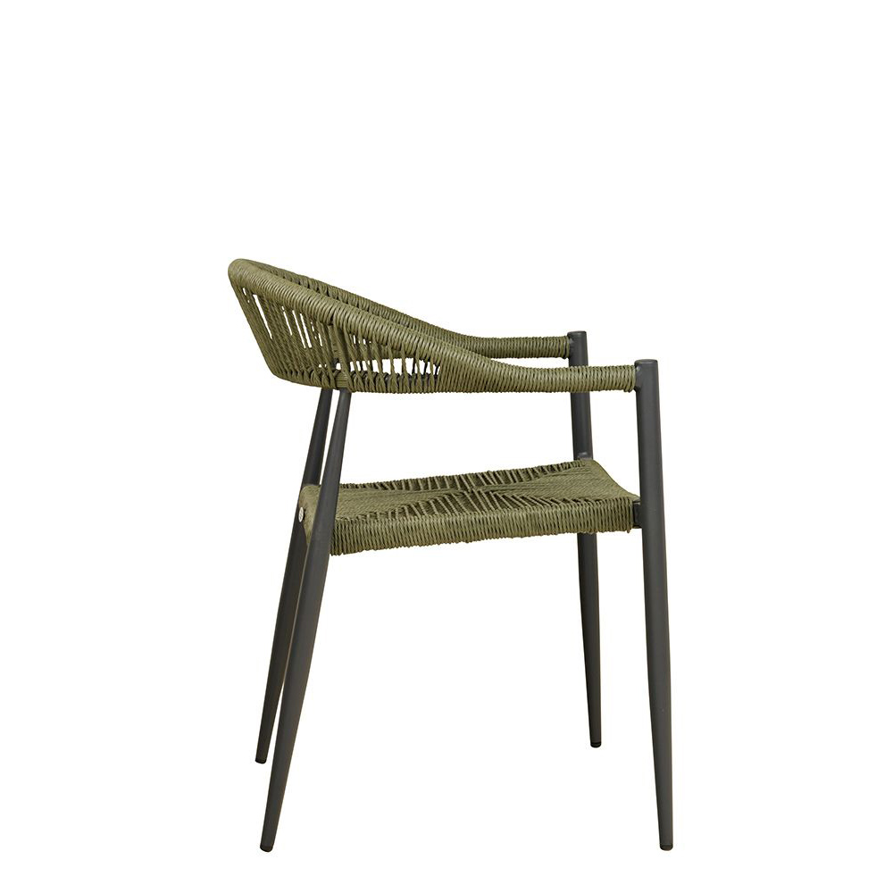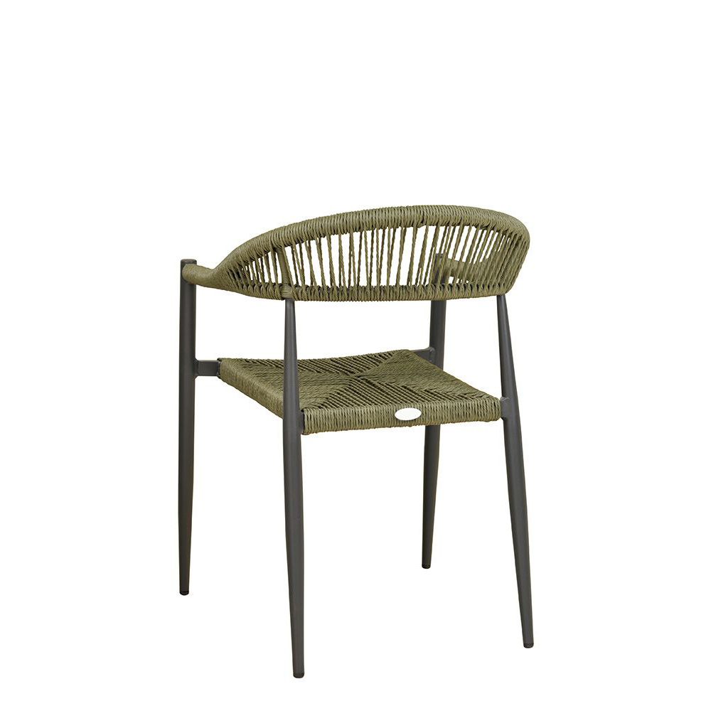 Ein Terrassenstuhl mit Armlehnen für höheren Sitzkomfort. Sitz und Rücken sind mit strapazierfähigen, witterungsbeständigem und pflegeleichtem Outdoorseil bespannt. Das Seil ist schnell trocknend. Der Stuhl ist stapelbar.