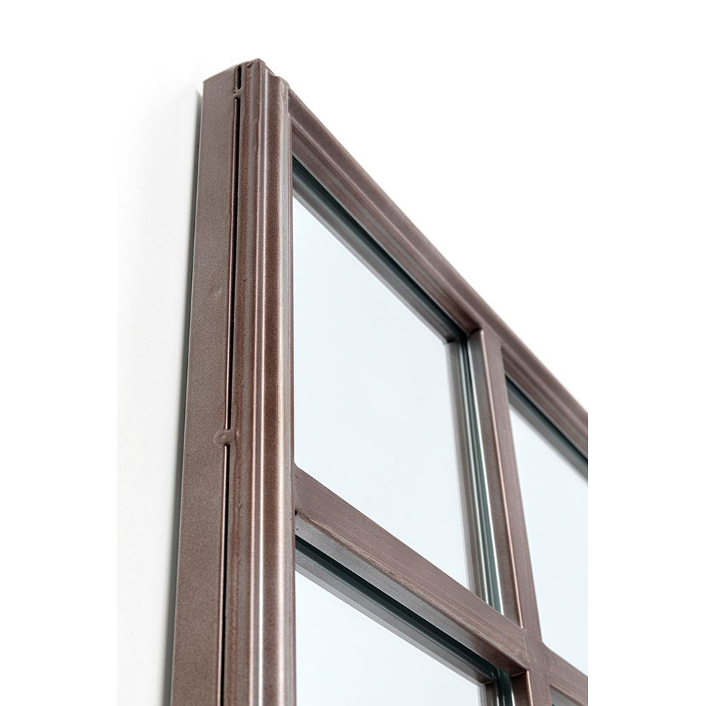 Der Spiegel "Window Iron" mit den Maßen 200 x 90 Zentimeter ist ein beeindruckendes und großes Spiegelobjekt in Fensteroptik. Der Rahmen besteht aus pulverbeschichtetem Stahl in Kupferfarbe, der dem Spiegel einen edlen und modernen Look verleiht. Das Spiegelglas selbst ist verspiegelt und sorgt für eine klare und deutliche Reflexion.