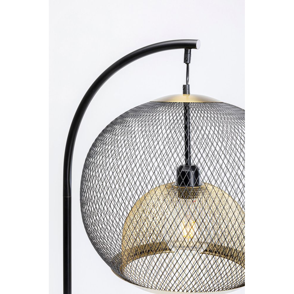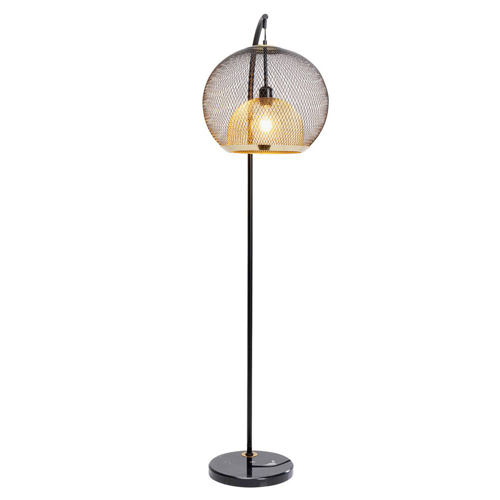 Diese Designer-Lampe beeindruckt durch ihre ausgefeilte Gestaltung. Ihr kugelförmiger Schirm besteht aus zwei Drahtgeflechten in den Farben Schwarz und Messing, wodurch der ansonsten kühlen und modernen Ausstrahlung der Wohnzimmerlampe Wärme und Eleganz verliehen wird. Perfekt platziert neben dem Sofa, verbreitet sie stimmungsvolles Licht. Die Verwendung hochwertiger Materialien garantiert eine langanhaltende Freude an dieser schwarzen Stehleuchte. Die technischen Spezifikationen umfassen: 230 V, 50/60 Hz, Fassung E27, ein Leuchtmittel, maximal 40 Watt (Leuchtmittel nicht enthalten).