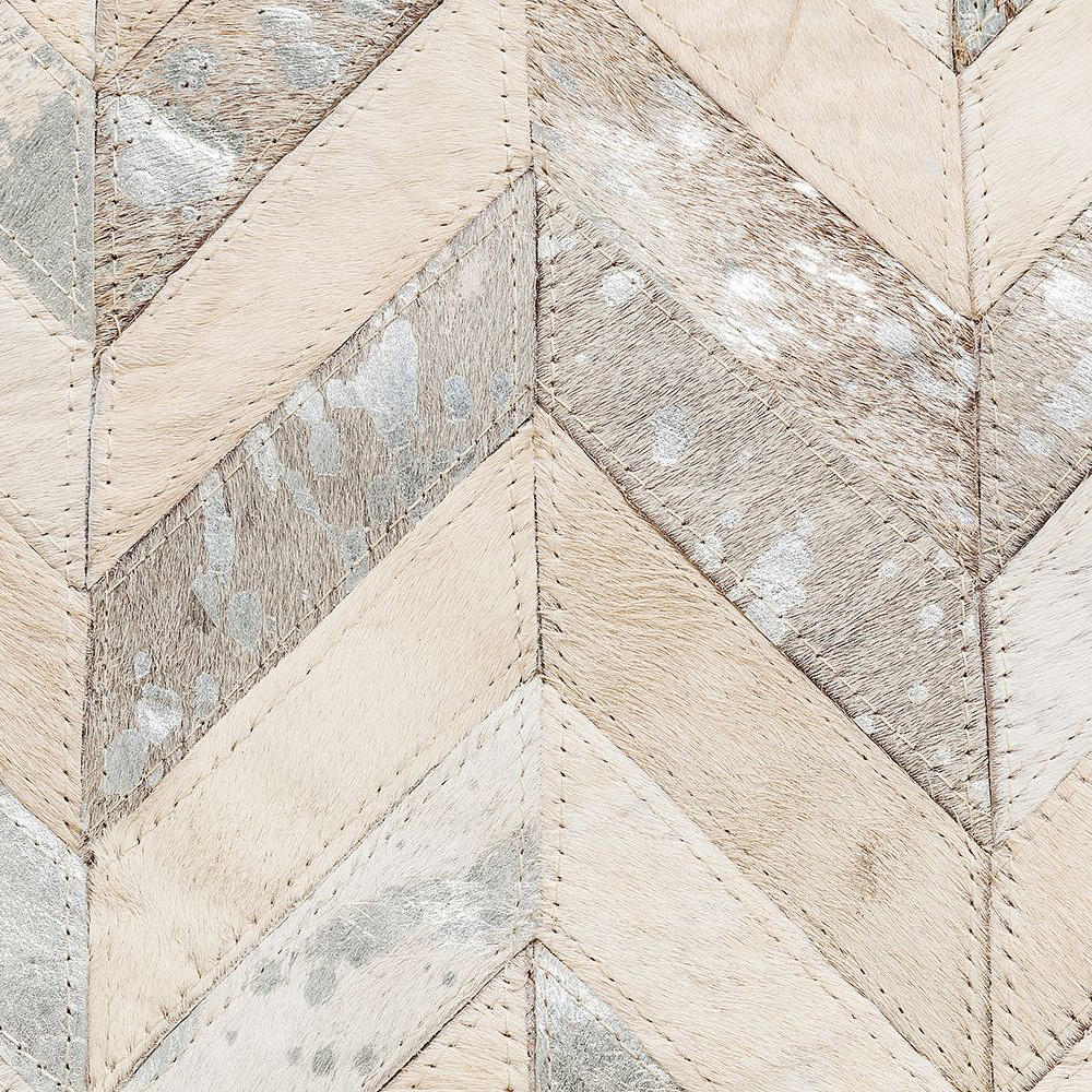 Rechteckiger Fellteppich in Beige mit den Maßen 170 x 240 Zentimeter. Patchwork-Design mit Fischgrät-Muster aus aneinandergenähten Fellstreifen. Dezente Metallic-Akzente verleihen dem Wohnzimmer-Teppich einen Hauch von Glanz. Die Unterseite besteht aus Baumwolle, für zusätzliche Sicherheit empfehlen wir eine Anti-Rutsch-Unterlage. Ein Highlight für jede Einrichtung dank der neutralen Farbe