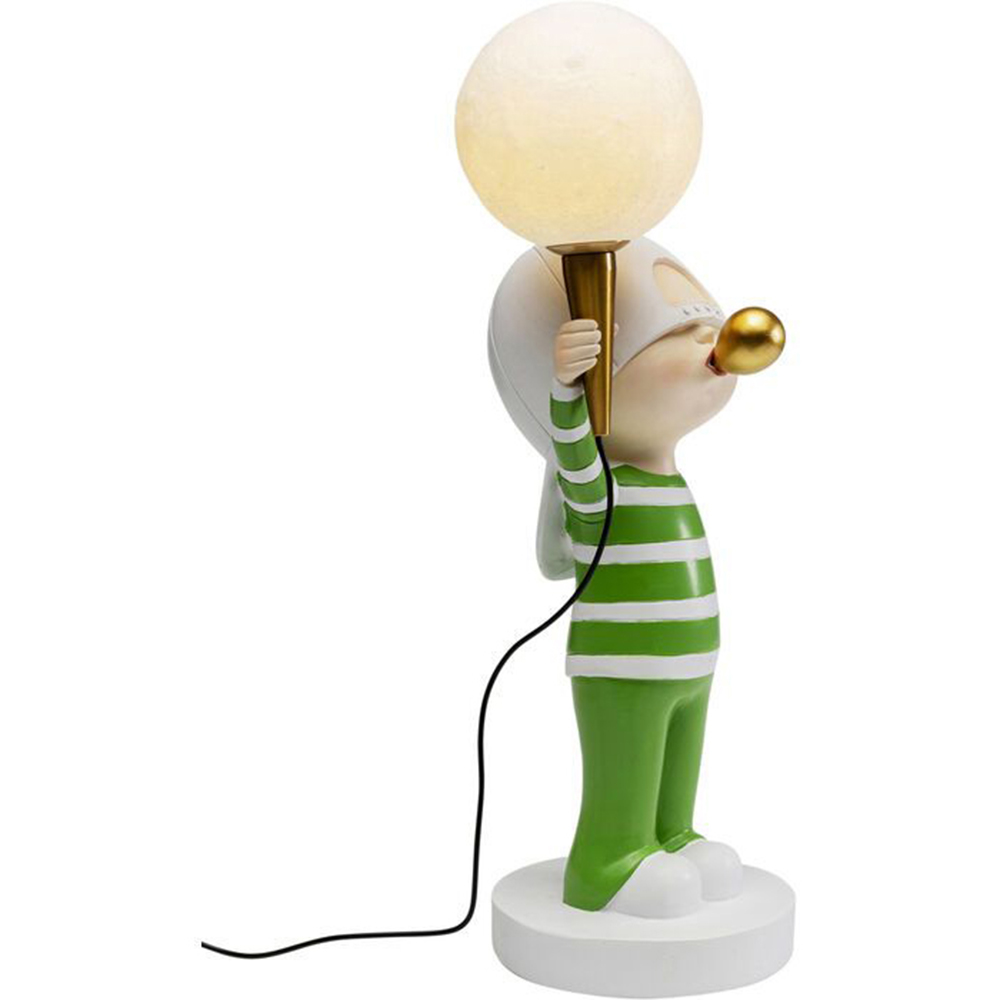 Die Tischleuchte mit dem Motiv eines Jungen, der eine Kaugummiblase bläst, ist ein verspieltes und einzigartiges Beleuchtungsstück für Ihr Zuhause. Die Leuchte hat eine Spannung von 230 V, 50/60 Hz, nutzt LED-Leuchtmittel, hat eine G9-Fassung und benötigt ein Leuchtmittel mit maximal 4 Watt, das im Lieferumfang enthalten ist. Der Schirm besteht aus Polyethylen, das Gestell und der Sockel sind aus Polyresin gefertigt. Die Kabellänge beträgt 200 cm und die Tischleuchte wird teilzerlegt geliefert.