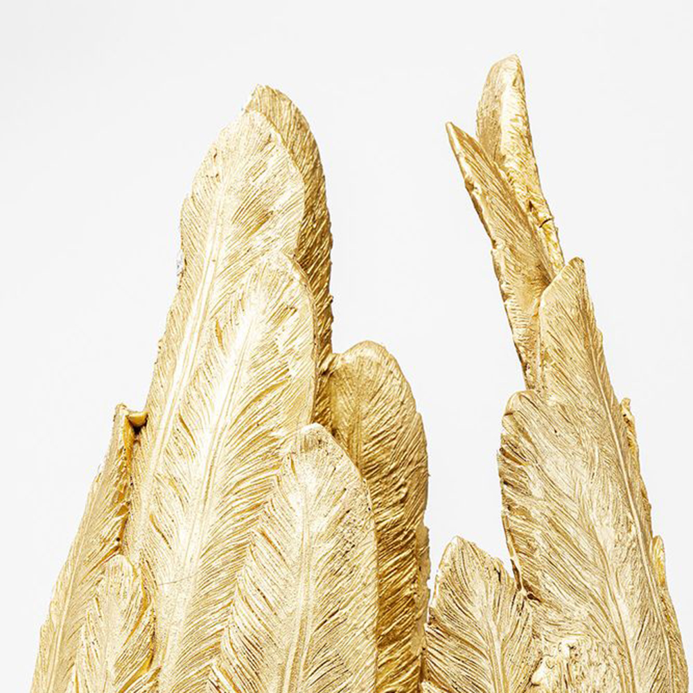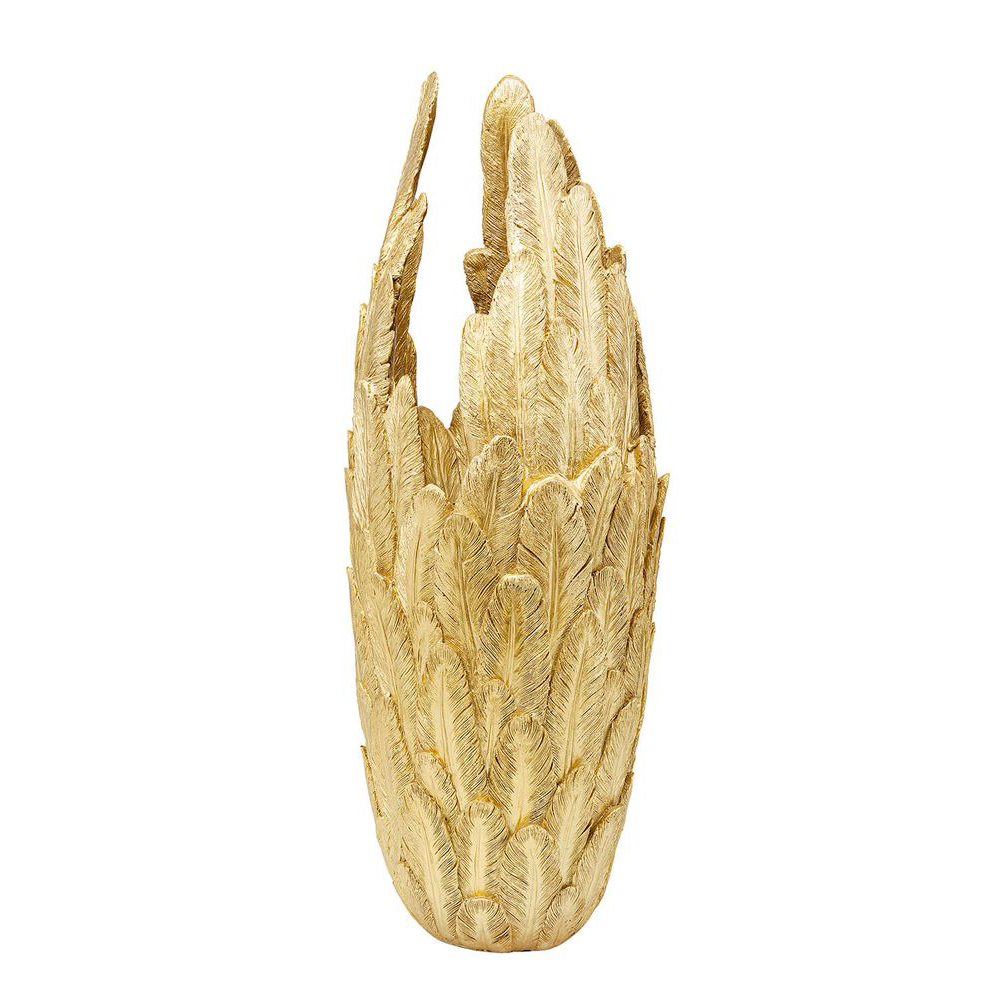 Eine äußerst geräumige Vase, die im Design an ein Federkleid erinnert und in goldener Farbe aus Kunstharz gefertigt ist. Dieses spektakuläre Deko-Objekt eignet sich hervorragend für den Flur, das Wohnzimmer oder den Eingangsbereich. Sie wirkt großartig als Bodenvase neben einer Konsole, einem Sofa oder einem Schrank.