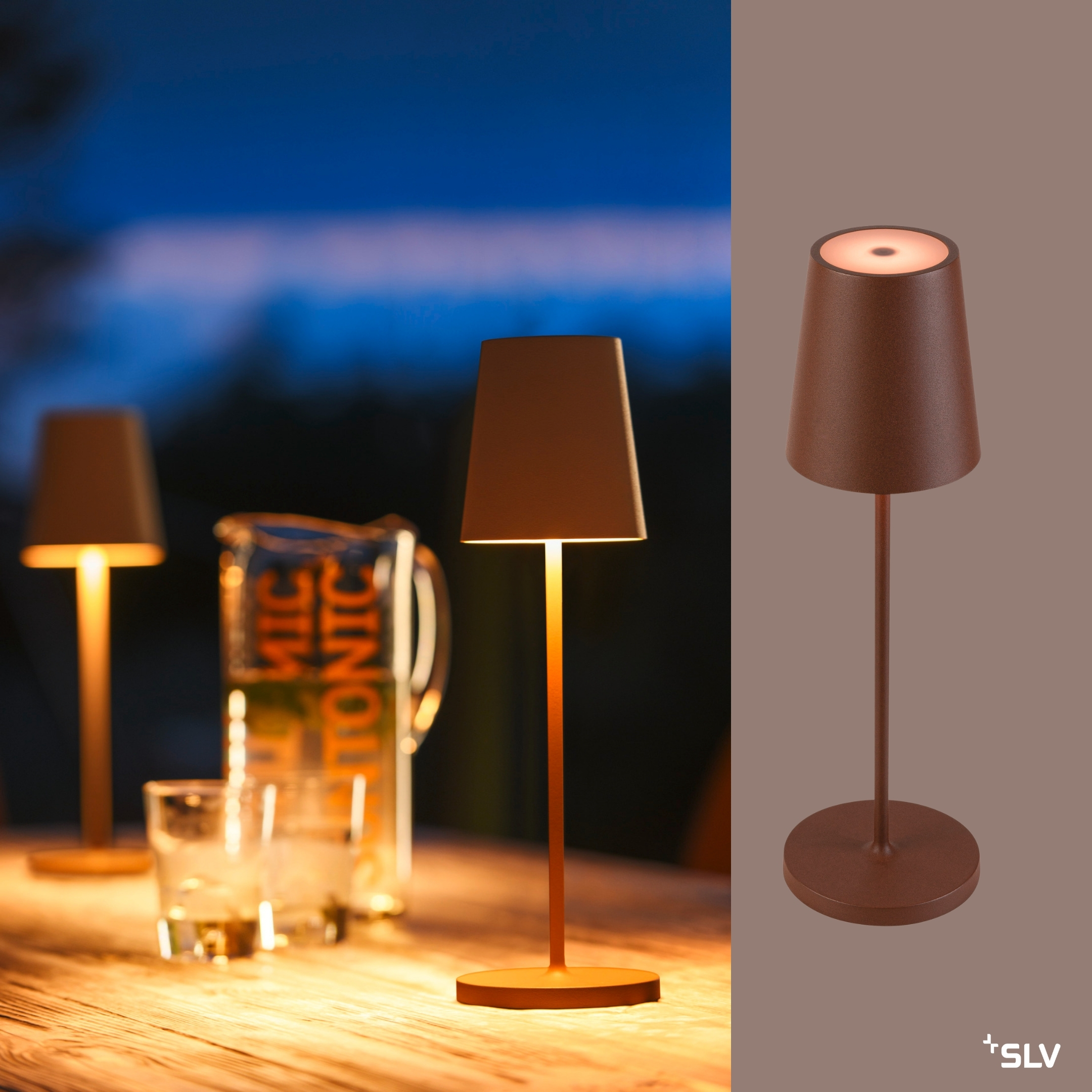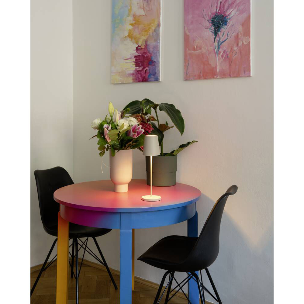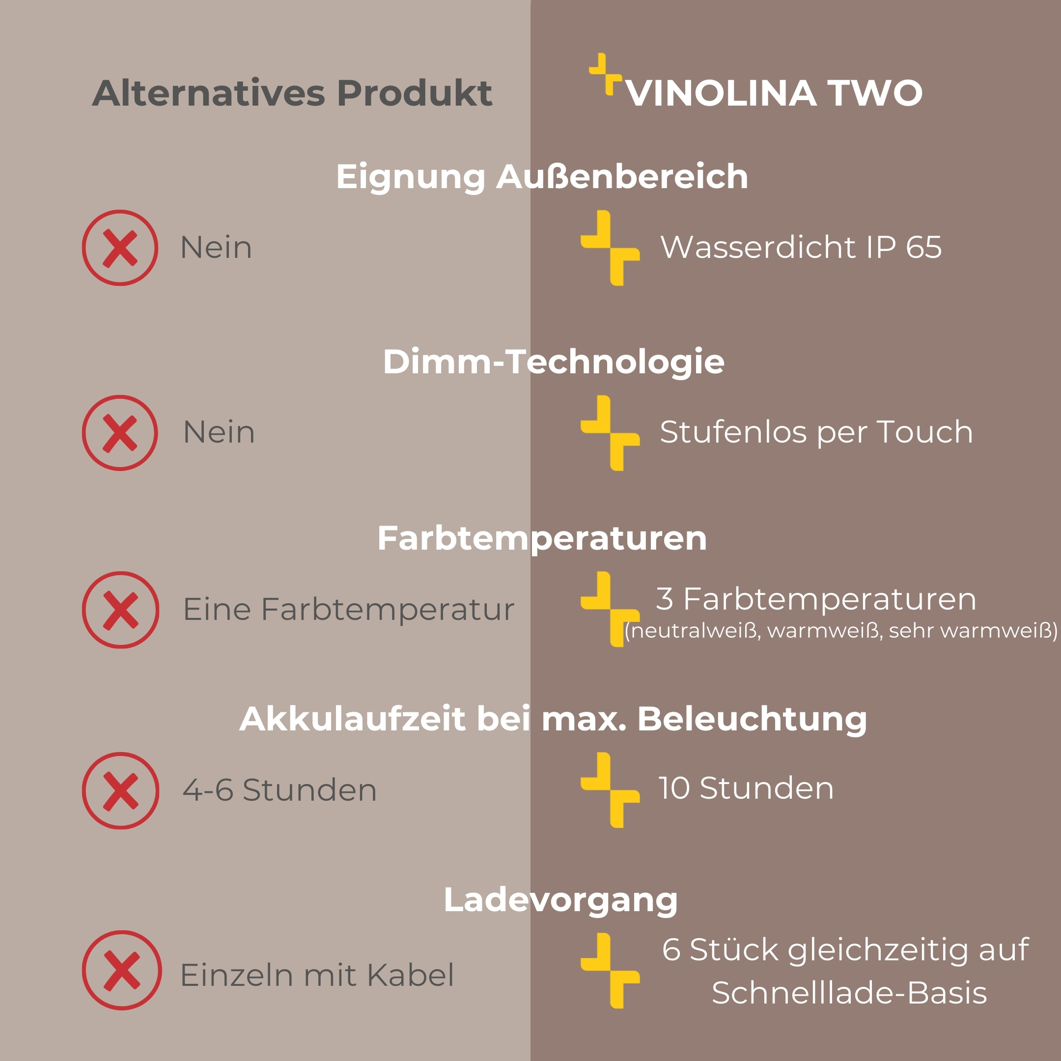 VINOLINA TWO heißt die hochwertig aus Aluminium gefertigte Tischleuchte, die sich dank Schutzart IP65 auch nach draußen mitnehmen lässt. In ihrem zeitlosen Design verströmt sie mit einer einzigen Akkuladung 10 Stunden ein nach oben und unten gerichtetes Licht, dessen Farbtemperatur via CCT-Switch einstellbar ist (2200K/2700K/3000K). Dabei ist die mobile Leuchte in sechs verschiedenen Trendfarben erhältlich. Die Ladestation ist mitsamt USB-Kabel im Lieferumfang enthalten. Erleben Sie mit VINOLINA TWO eine elegante Lösung in Sachen Licht, die via Touchschalter noch dimmbar ist.