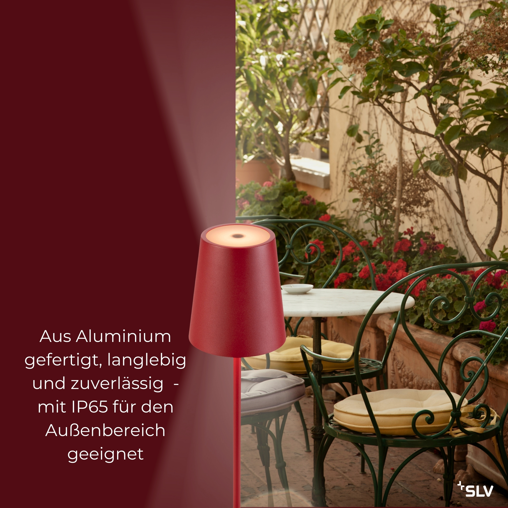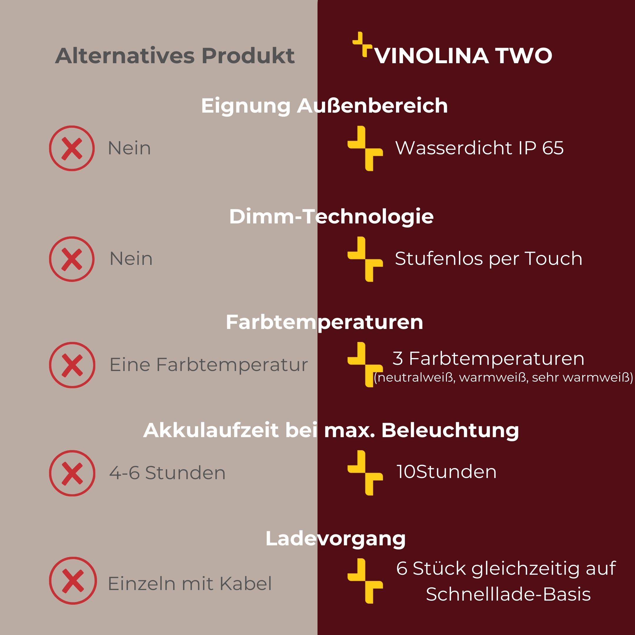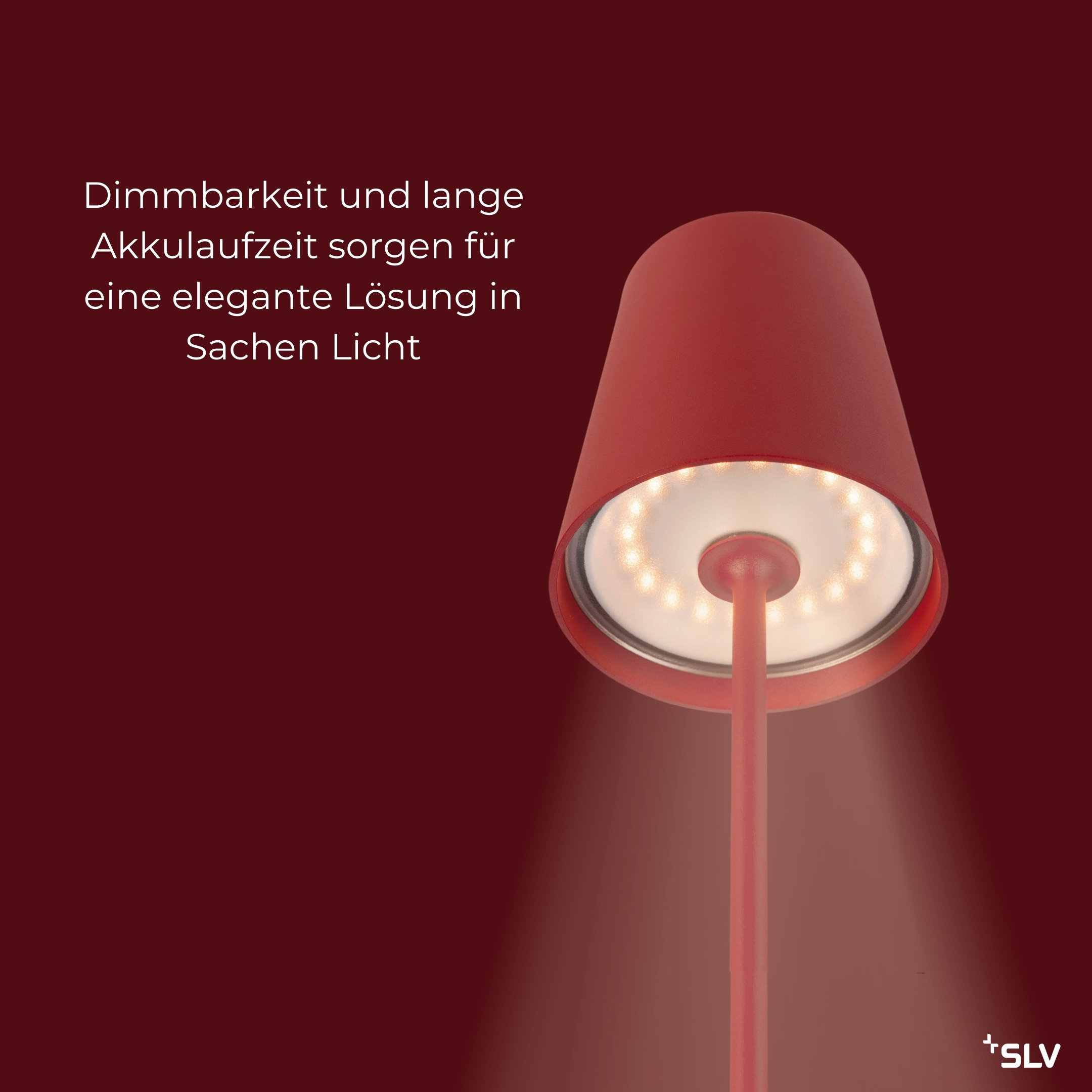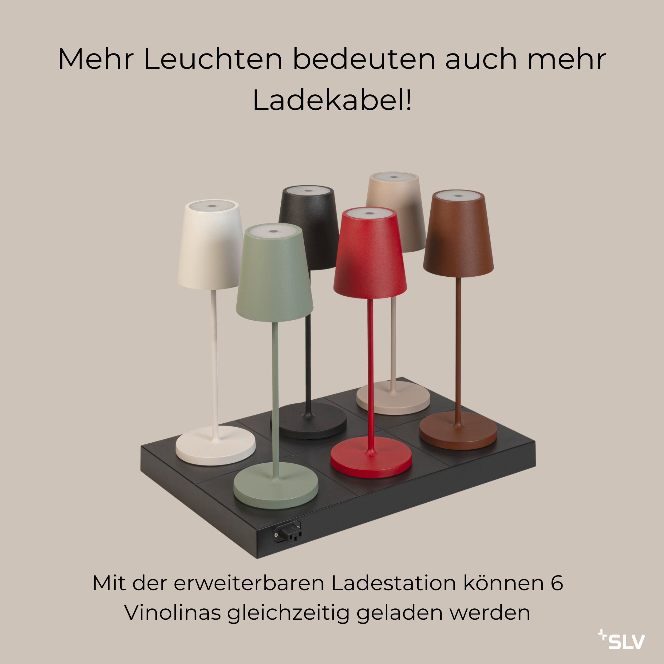 VINOLINA TWO heißt die hochwertig aus Aluminium gefertigte Tischleuchte, die sich dank Schutzart IP65 auch nach draußen mitnehmen lässt. In ihrem zeitlosen Design verströmt sie mit einer einzigen Akkuladung 10 Stunden ein nach oben und unten gerichtetes Licht, dessen Farbtemperatur via CCT-Switch einstellbar ist (2200K/2700K/3000K). Dabei ist die mobile Leuchte in sechs verschiedenen Trendfarben erhältlich. Die Ladestation ist mitsamt USB-Kabel im Lieferumfang enthalten. Erleben Sie mit VINOLINA TWO eine elegante Lösung in Sachen Licht, die via Touchschalter noch dimmbar ist.