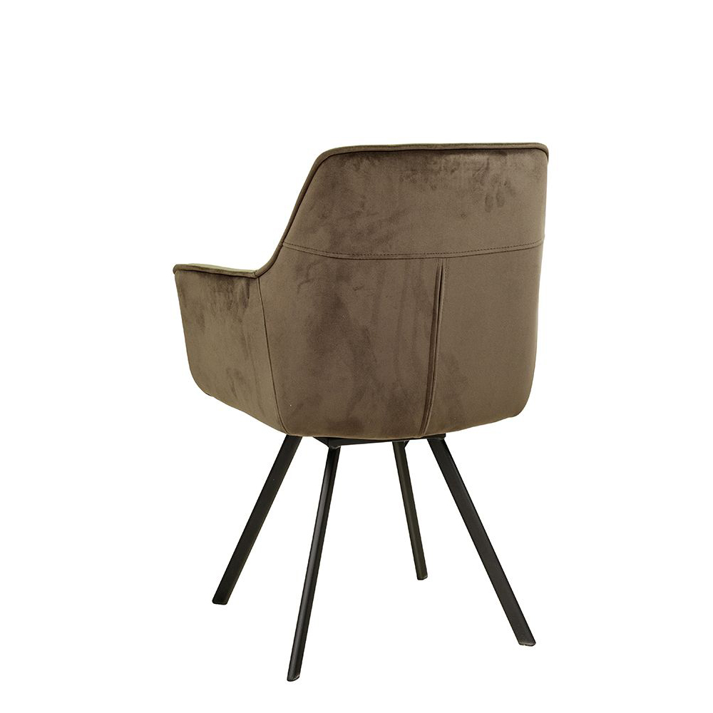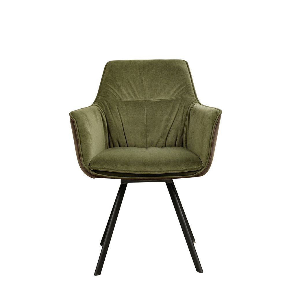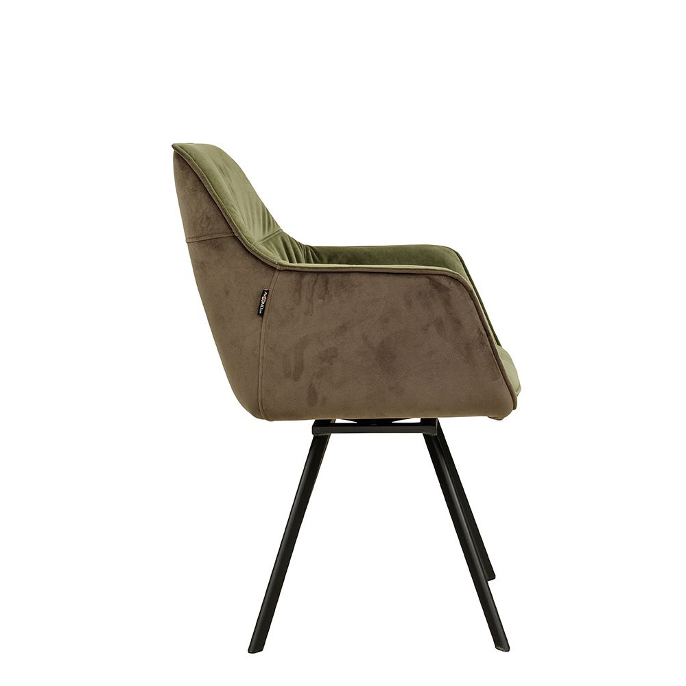 Der Voggo Arm Forest Duotone ist ein Vollpolsterstuhl mit Armlehne und drehbarem Metallgestell, der mit Veloursstoff bezogen ist. Der Bezug hat einen samtartigen Glanz und fühlt sich angenehm weich an.