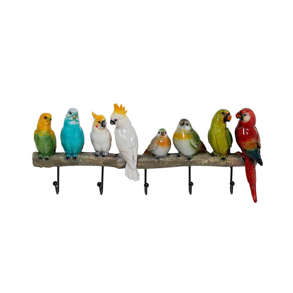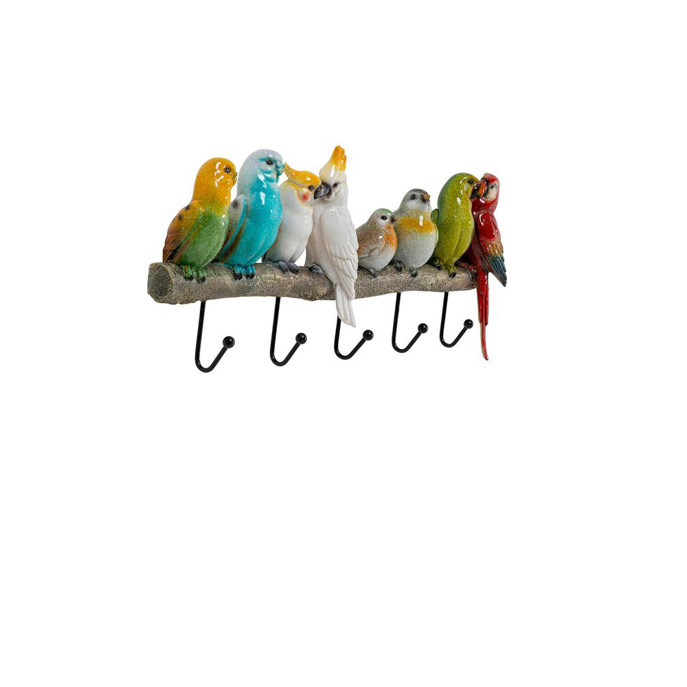 Diese farbenfrohe Garderobenleiste mit fünf robusten Stahlhaken und einer Holzoptik-Leiste wird von einem bezaubernden Vogelschwarm bewacht. Sie ist nicht nur ein praktischer Ort zur Aufbewahrung von Kleidung, sondern eignet sich auch hervorragend für Schmuck oder Handtaschen im Schlafzimmer oder Ankleidebereich.
