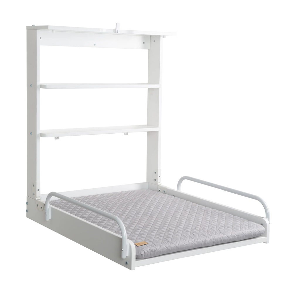 Alle verwendeten Materialien der Wandwickelkommode sind schadstoffgeprüft, zertifiziert und werden regelmäßig überprüft. Das Wickelregal ist aus weiß lackiertem Schichtholz gefertigt und bis 15 kg belastbar. Die Oberfläche der phthalatfreien Wickeltischauflage ist abwischbar und pflegeleicht.
