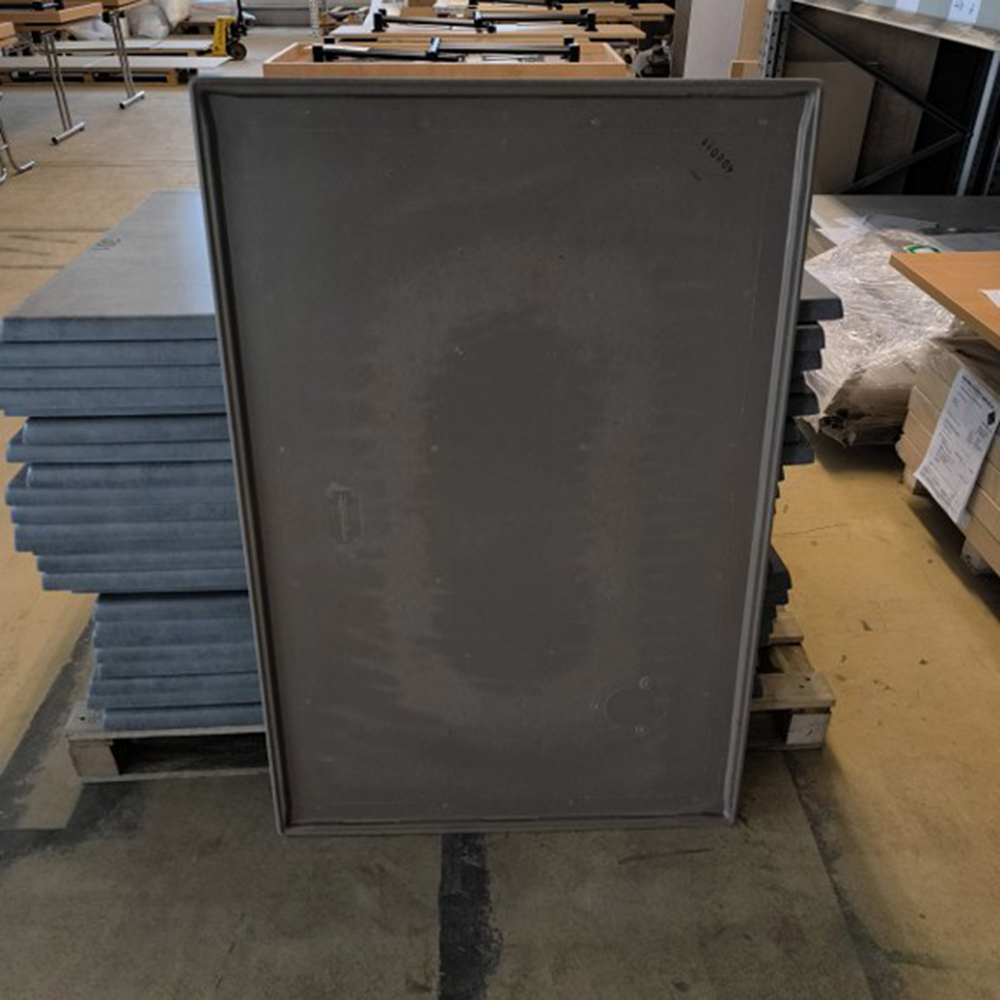 Zustand: B, Schraublöcher Unterseite, leichte oberflächliche Nutzungsspuren (TP werden feucht gereinigt), leichte konvexe Verformung